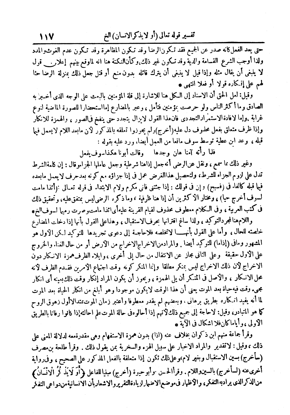 وقرأ جماعة منهم ابن ذكوان بخلاف عنه اذا بدون همرة الأستفهام وهي مقدرة معه لدلالة المعنى على ذلك وقيل : لاتقدير والمراد الاخبار على سبيل الهزء والسخريه بمن يقول ذلك وقرأ طلحة بن مصرف سأخرج بسين الأستقبال وبغير لام وعلى ذلك تكون إذا متعلقة بالفعل المذكور على الصحيح وفي رواية اخرى عنه لساخرج بالسين واللام وقرأ الحسن وابو حيوة أخرج مبنيا للفاعل او لا يذكر الانسان من الذكر الذي يراد به التفكر والأظهار في موضع الاضمار لزيادة التقرير والأشعار بأن الانسانية من دواعي التفكر