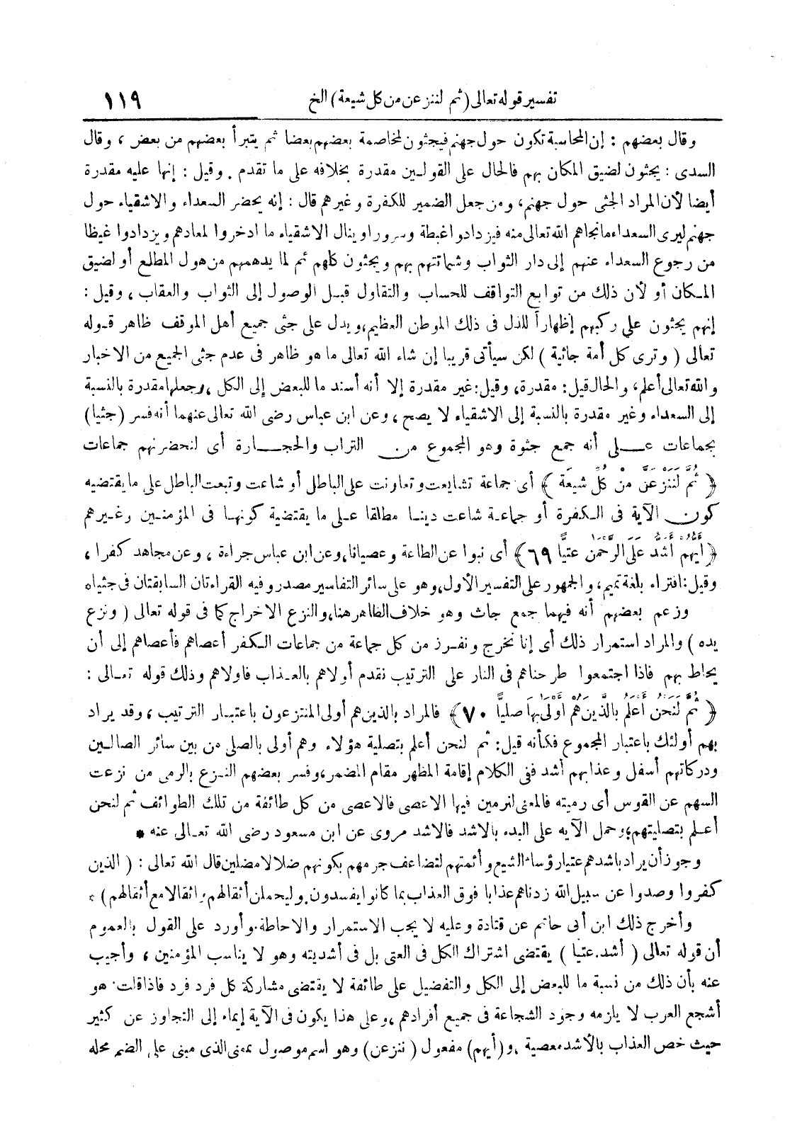 وقال بعضم : إن المحاسبه تكون حول جهنم فيجثون لمخاصمة بعضهم بعضا ثم يتبرأ بعضهم من بعض وقال السدى : يجثون لضيق المكان بهم فالحال على القولين مقدرة بخلافه على ما تقدم وقيل : انها عليه مقدرة أيضا لأن المراد الجثى حول جهنم ومن جعل الضمير للكفرة وغيرهم قال : أنه يحضر السعداء والأشقياء حول جهنم ليرى السعداء ما نجاهم الله تعالى منه فيزدادوا غبطى وسرور أو ينال الأشقياء ما ادخروا لمعادهم ويزدادوا غيضا من رجوع السعداء عنهم إلىدار الثواب وشماتتهم بهم وجثون كلهم ئم لما يداهمهم من هول المطلع لضيق المكان أو لأن ذلك من توابع التواقف للحساب والتقأول قبل الوصول إلىالثواب والعقاب وقيل أنهم يجثون على ركبهم اظهارا للذل في ذلك الموطن العظيم ويدل على جثى جميع أهل الموقف ظاهر قوله تعالى وترى كل امه جاثيه لكن سيأتي قريبا أن شاء الله تعالى ما هو ظاهر في عدم جثي الجميع من الأخبار والله أعلم والحال قيل : مقدرة وقيل : غير مقدرة إلا أنه اسند ما للبعض إلىالكل وجعلها مقدرة بالنسبة إلىالسعداء وغير مقدرة بالنسبة إلىالأشقياء لا يصح وعن ابن عباس رضى الله تعالى عنهما أنه فسر جثيا بجماعات على أنه جمع جثوا وهو المجموع من التراب والحجارة أي لنحضرنهم جماعات ثم لتنزعنا من كل شيعة أي جماعه تشايعة وتعاونة على الباطل أو شاعة وتبعت الباطل على ما يقتضيه كون الآية في الكفرة أو جماعة شاعت دينا مطلقا على ما يقتضيه كونها في المؤمنين وغيرهم أيهم أشد على الرحمن عتيا