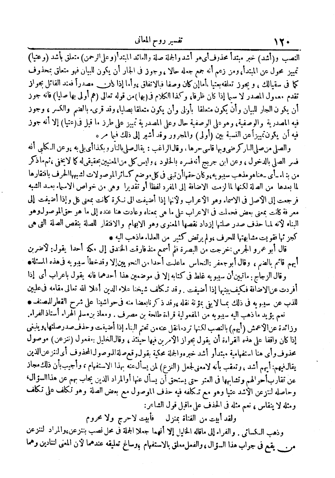 نعم يؤيد ما ذهب اليه سيبويه من المفعوليه قراءة طلحة بن مصرفومعاذ بن مسلم الهراء استاذ الفراء وزائدة عن الأعمش أيهم بالنصب لاكنه ترد ما نقل عنه من تحتم البناء إذا اضيفت وحذف صدر صلتها وينبغي إذا كان واقفا على هذه القراءة أن يقول بجواز الأمرين فيها حينئذ وقال الخليل : مفعول ننزعن موصول محذوف واى هنا استفهامية مبتدأ وأشد خبره والجملة محكية بقول وقع صلة للموصول المحذوف أي لننزعن الذين يقال فيهم : أيهم أشد وتعقب بأنه لا معنى لجعل النزع لمن يسأل عنه بهذا الأستفهام وأجيب بأن ذلك مجاز عن تقارب احوالهم وتشابهها في العتو حتى يستحق أن يسأل عنها أو المراد الذين يجاب بهم عن هذا السؤال وحاصله لننزعن الأشد عتيا وهو من تكلفه فيه حذف الموصول مع بعض الصلة وهو تكلف على تكلف ومثله لا ينقاس نعم مثله في الحذف على ماقيل قول الشاعر : ولقد ابيت من الفتاة بمنزل فابيت لا حرج ولا محروم وذهب الكسائى والفراء إلىماقاله الخليل إلا انهما جعلا الجمله في محل نصب بننزعن والمراد لننزعن من يقع في جواب هذا السؤال والفعل معلق بالاستفهام وساغ تعليقة عندهما لأن المعنى لننادين وهما