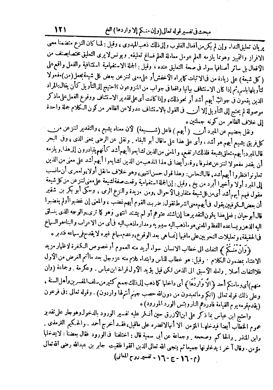 وان منكم التفات إلى خطاب الانسان سواء اريد منه العموم أو خصوص الكفرة لاظهار مزيد الاعتناء بمضمون الكلام وقيل : هو خطاب للناس وابتدأ كلام منه عز و جل بعد ما اتم الغرض من الأول فلا التفات اصلا وامله الأسبق إلىالذهن لكن قيل يؤيد الأول قراءة ابن عباس وعكرمة وجماعة وان منهم أي وما منكم أحد الا واردها أي دخلها كما ذهب إلىذلك جمع كثير من سلف المفسرين وأهل السنة وعل ذلك قوله تعالى انكم وما تعبدون من دون الله حصب جهنم انتم لها واردون وقوله تعالى : في فرعون يقدم قومه يوم القيامة فاوردهم النار وبئس الورد المورود