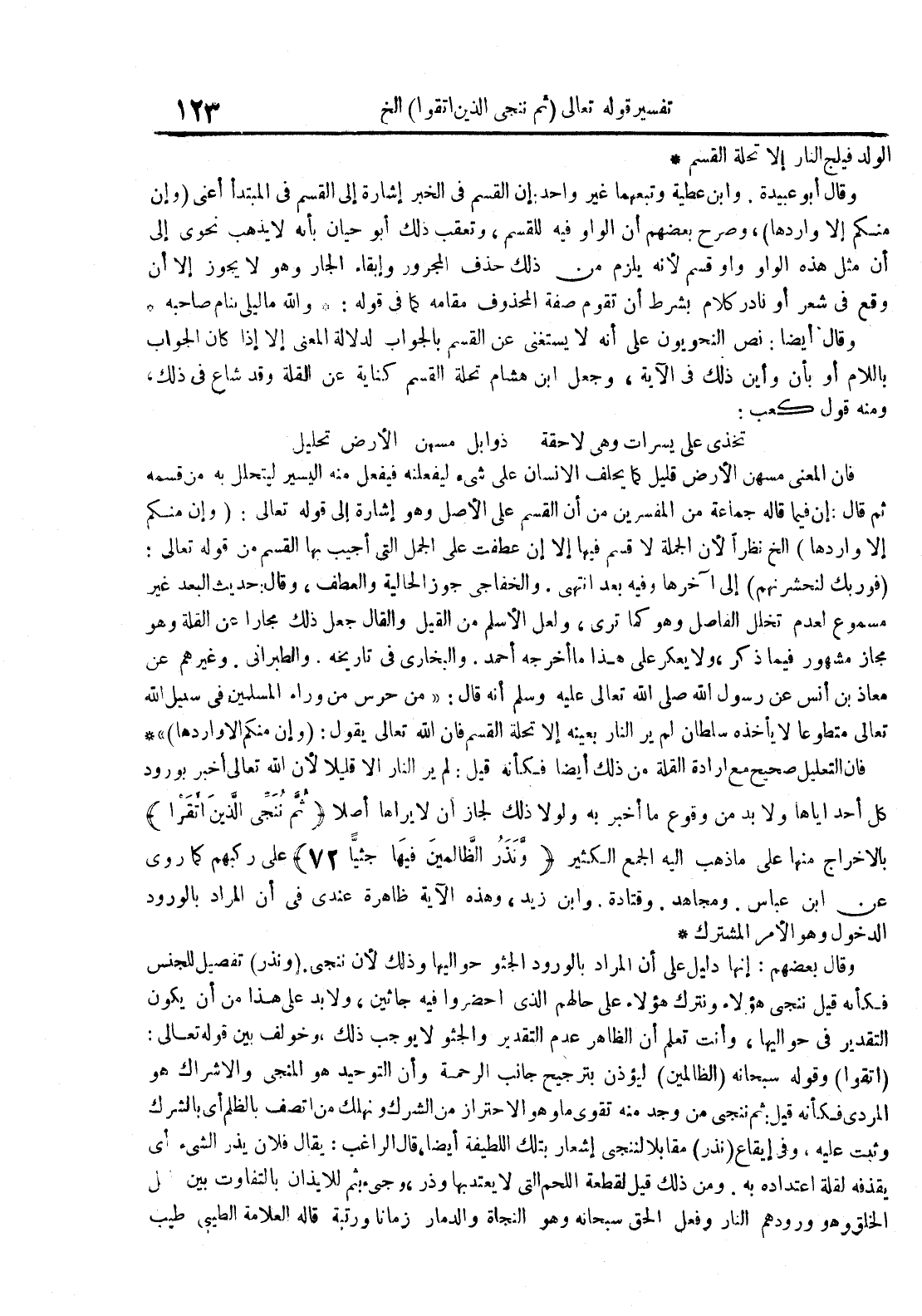 وقال أبو عبيدة وابن عطية وتبعهما غير واحد : أن القسم في الخبر أشارة إلىالقسم في المبتدأ اعنى وان منكم إلا واردها وصرح بعضهم أن الواو فيه للقسم وتعقب ذلك أبو حيان بأنه لا يذهب نحوى إلىان مثل الواو واو القسم لأنه يلزم من ذلك حذف المجرور وابقاء الجار وهو لايجوز إلا أن وقع في شعر أو نادر كلام بشرط أن تقوم صفة المحذوف مقامه كما في قوله :