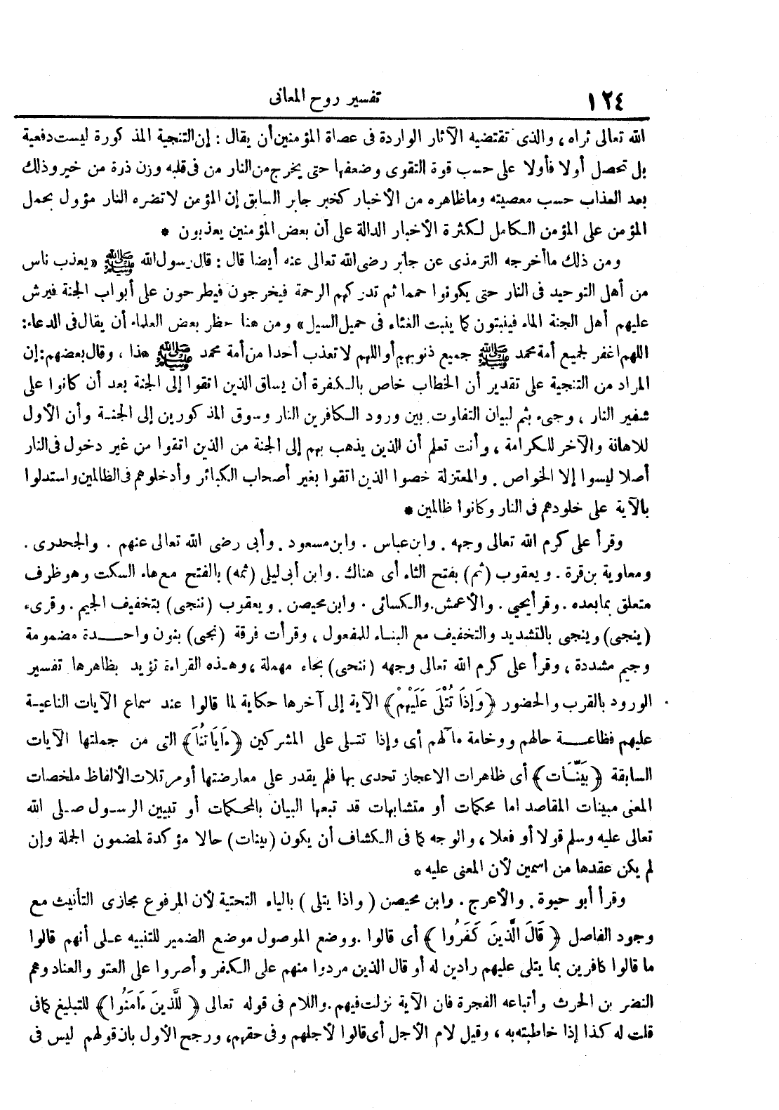 الله تعالى ثراه والذي تقتضيه الاثار الواردة في عصاة المؤمنين أن يقال : أن التنجيه المذكوره ليست دفعيه بل تحصل أولا فأولا على حسب قوة التقوى وضعفها حتى يخرج من الثار من في قلبه وزن ذرة من خير وذلك بعد العذاب حسب معصيته وما ظاهره من الأخبار كخبر جابر السابق أن المؤمن لاتضره النار مؤول بحمل المؤمن على المؤمن الكامل لكثرة الأخبار الدالة على أن بعض المؤمنين يعذبون