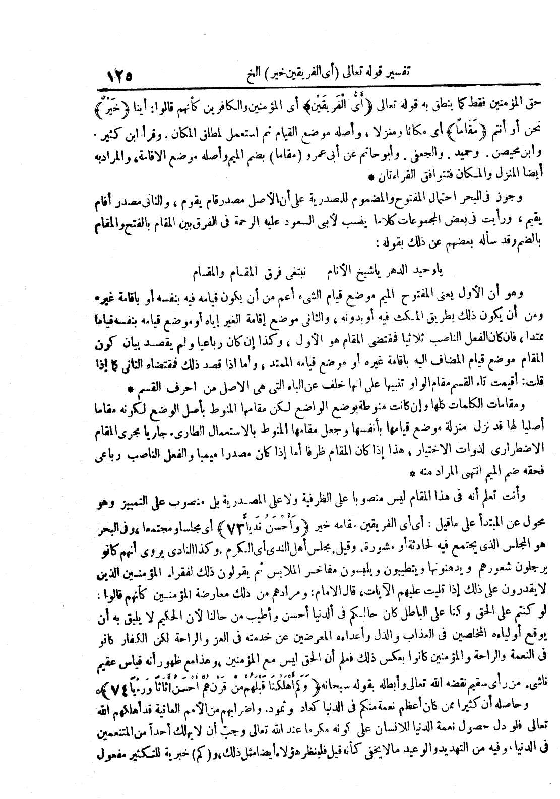 وجوز في البحر احتمال المفتوح والمضموم للمصدرية على أن الأصل مصدر قام يقوم والثاني مصدر أقام يقيم ورايت في بعض المجموعات كلاما ينسب لابى السعود عليه الرحمه في الفرق بين المقام بالفتح والمقام بالضم وقد سأله بعضهم عن ذلك بقوله : يا وحيد الدهر يا شيخ الانام نبتغي فرق المقام والمقام وهو أن الأول يعنى المفتوح الميم موضع قيام الشئ اعم من أن يكون قيامه فيه بنفسه أو باقامة غيره ومن أن يكون ذلك بطريق المكث فيه أو بدونه والثاني موضع إقامة الغير إياه أو موضع قيامه بنفسه قياما ممتدا فان كان الفعل الناصب ثلاثيا فمقتضى الكلام هو الأول وكذا أن كان رباعيا ولم يقصد بيان كون المقام موضع قيام المضاف اليه باقامة غيره أو موضع قيامه الممتد وأما إذا قصد ذلك فان مقتضاه الثاني كما إذا قلت :