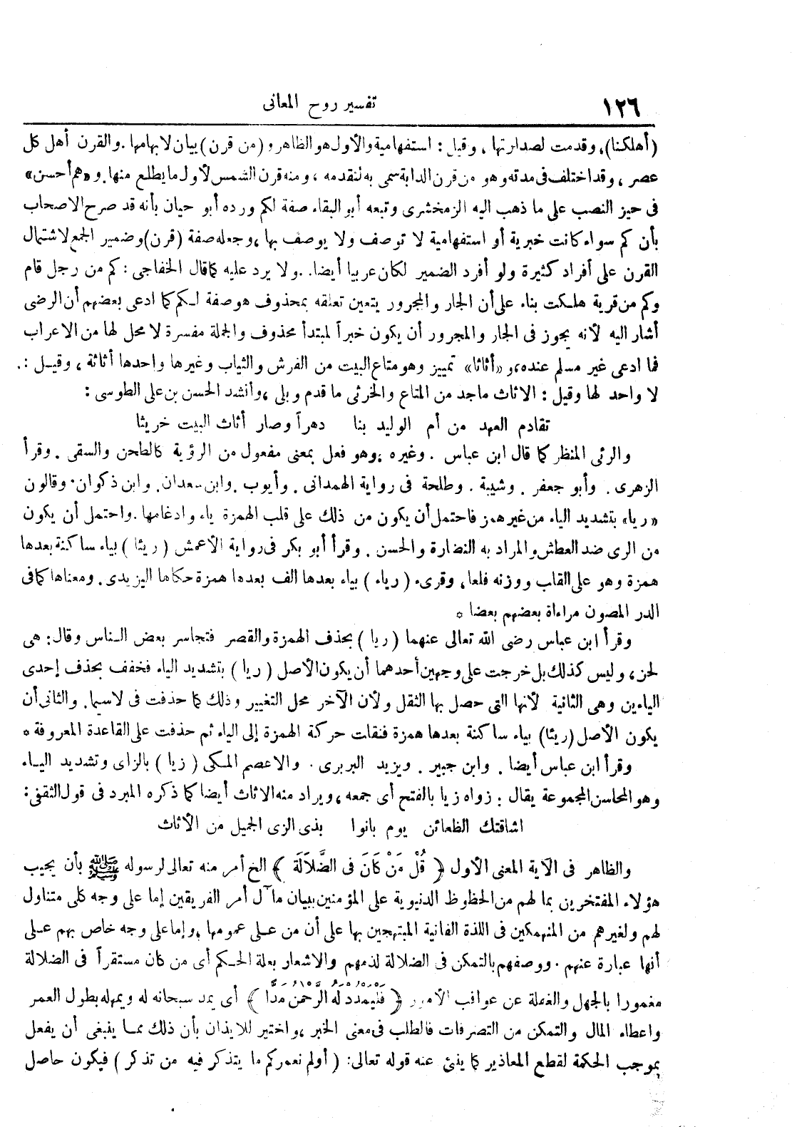 أهلكنا وقدمت لصدارتها وقيل : استفهامية والأول هو الظاهرو من قرن بيان لابهامها والقرن أهل كل عصرا وقد اختلف في مدته وهو من قرن الدابة سمى به لتقدمة ومنه قرن الشمس لأول ما يطلع منها وهم احسن في حيز النصب على ما ذهب اليه الزمخشري وتبعه أبو البقاء صفه لكم ورده أبو حيان بأنه قد صرح الأصحاب بأن كم سواء كانت خبرية أو استفهامية لا توصف ولا يوصف بها وجعله صفة قرن وضمير الجمع لاشتمال القرن على أفراد كثيرة ولو افرد الضمير لكان عربيا ايضا ولا يرد عليه كما قال الخفاجي : كم من رجل قام وكم من قرية هلكت بنا على أن الجار والمجرور يتعين تعلقه بمحذوف هو صفة لكم كما ادعى بعضهم أن الرضى أشارة اليه بأنه يجوز في الجار والمجرور أن يكون خبر لمبتدأ محذوف والجملة مفسرا إلا محلها من الأعراب فما ادعى غير مسلم عنده واثاثا تمييز وهو متاع البيت من الفرش والثياب وغيرها واحدها اثاثة وقيل : لا واحد لها وقيل : الاثاث ما جد من المتاع والخرثى ما قدم وبلى وانشد الحسن بن علي الطوسي : تقادم العهد من ام الوليد بنا دهرا وصارا اثاث البيت خريثا والرئى المنظر كما قال ابن عباس وغيره وهو فعل بمعنى مفعول من الرؤيه كالطحن والسقي وقرأ الزهري وابو حعفر وشيبة وطلحة في روايت الهمداني وايوب وابن سعدان وابن ذكوان وقالون ريا بتشديد الياء من غير همز فاحتمل أن يكون من ذلك على قلب الهمزة ياء وادغامها واحتمل أن يكون من الرى ضد العطش والمراد به النضارة والحسد وقرأ أبو بكر في رواية الأعمش ريئا بياء ساكنة بعدها همزة وهو على القلب ووزنه فلعا وقرئ رياء بياء بعدها الف بعدها همزة حكاها اليزيد ومعنها كما في الدرب المصون مراءاة بعضهم بضعا