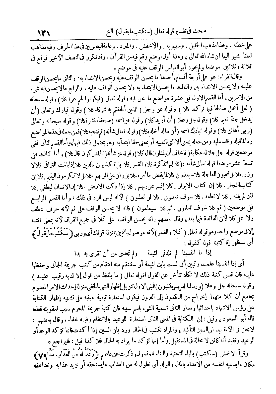 وقال الفراء : هو على اربعة اقسام أحدها ما يحسن الوقوف عليه ويحسن الأبتداء به والثاني ما يحسن التوقف عليه ولا يحسن الأبتداء به والثالث ما يحسن الأبتداء به ولا يحسن الوقف عليه والرابع ما لا يحسن فيه شئ من الأمرين أماالقسم الأول ففي عشرة مواضع ما نحن فيه وقوله تعالى ليكونوا لهم عزا كلا وقوله سبحانه لعلى اعمل صالحا فيما تركت كلا وقوله عز و جل الذين الحقتم به شركاء كلا وقوله تبارك وتعالى ان يدخل جنة نعيم كلا وقوله جل وعلا ان ازيد كلا وقوله عز اسمه صحفاه منشرة كلا وقوله سبحانه وتعالى ربى اهانن كلا وقوله تبارك اسمه ان ماله اخلده كلا وقوله تعالى شأنه ثم ننجيه كلا فمن جعله في هذه المواضع ردا لما قبله وقف عليه ومن جعله بمعنى إلا التي للتنبيه أو بمعنى حقا ابتدأ به وهو يحتمل ذلك فيها وأماالقسم الثاني ففي موضعين قوله جل جلاله حكاية فاخاف أن يقتلون قال كلا وقوله عز شأنه انا لمدركون قال كلا وأماالثالث ففي تسعة عشر موضعا قوله تعالى شأنه : كلا انها تذكرة كلا والقمر كلا بل تكذبون بالدين كلا إذا بلغت التراقى كلا لا وزر كلا بل تحبون العاجلة كلا سيعلمون كلا لما يقض ما امره كلا بل ران على قلوبهم كلا بل لا تكرمون اليتيم كلا أن كتاب الفجار كلا أن كتاب الابرار كلا أنهمعن ربهم كلا إذا دكت الأرض كلا أن الانسان ليطغى كلا لئن لم ينته كلا لا تطعه كلا سوف تعلمون كلا لو تعلمون لأنه ليس للرد في ذلك وأماالقسم الرابع ففي موضعين ثم كلا سوف تعلمون ثم كلا سيعلمون فانه لا يحسن الوقف على ثم لأنه حرف عطف ولا على كلا لأن الفائدة فيما بعد وقال بعضهم : أنه يحسن الوقف على كلا في جميع القرآن لأنه بمعنى انته إلا في موضع واحد وهو قوله تعالى كلا والقمر لأنه موصول باليمين بمنزلة قولك أي وربى سنكتب ما يقول أي سنظهر انا كتبنا قوله كقوله : إذا ما انتسبنا لم تلدنى لئيمة ولم تجدى من أن تقرى به بدا أي إذا انتسبنا علمت وتبين انى لست بابن لئيمة أو سننتقم من انتقام من كتب جريمة الجانى وحفظها عليه فان نفس كتبه ذلك لا تكاد تتأخر عن القول لقوله تعالى ما يلفظ من قول إلا لديه رقيب عتيد وقوله سبحانه جل وعلا ورسلنا لديهم يكتبون فمبنى الأول تنزيل اظهار الشئ ما لخفى منزلة احداث الأمر المعدوم بجامع أن كل منهما أخراج من الكمون إلى البروز فيكون استعارة تبعية مبنية على تشبيه اظهار الكتابة على رؤس الاشهاد بأحداثها ومدار الثاني تسمية الشئ باسم سببه فان كتبه جريمة المجرم سبب لعقوبته قطعا قال أبو السعود وقيل : أن الكتابه في المعنى الثاني استعارة للوعيد بالانتقام وفيه خفاء وقال بعضهم : لا مجاز في الآية بيد أن السين للتاكيد والمراد نكتب في الحال ورد بأن السين إذا اكدت فانما تؤكد الوعد أو الوعيد وتفيد أنه كائن لا محالة في المستقبل وأماانها تؤكد ما يراد به الحال فلا كذا قيل : فليرجع