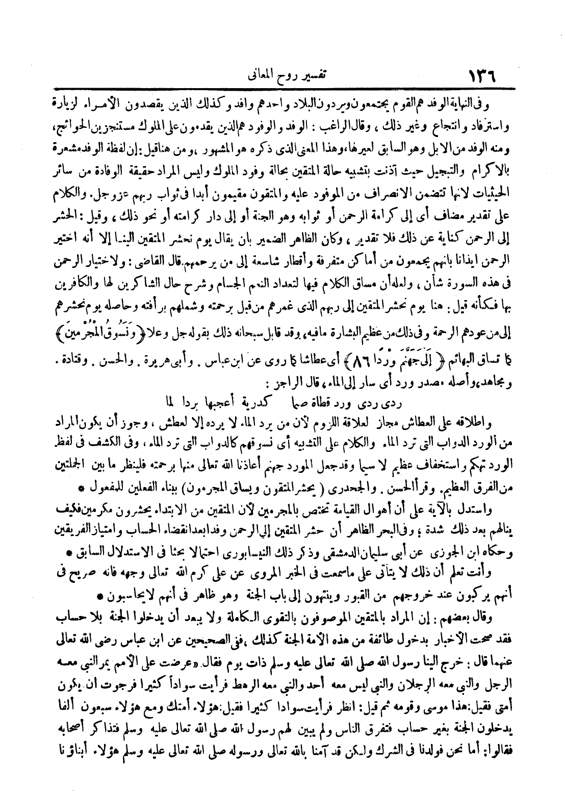 - أي عطاشا كما روى عن ابن العباس وابى هريرة والحسن وقتادة ومجاهد واصله مصدر ورد أي سار إلى الماء قال الراجز : ردى ردى ورد قطاة صما كدرية اعجبها بردا لما واطلاقه على العطاش مجاو لعلاقة اللزوم لأن من يرد الماء لا يرده إلا لعطش وجوز أن يكون المراد من الورد الدواب التي ترد الماء والكلام على التشبيه أي نسوقهم كالدواب التي ترد الماء وفي الكشف في لفظ الورد تهكم واستخفاف عظيم لا سيما وقد جعل المورد جهنم اعاذنا الله تعالى منها برحمته فلينظر ما بين الجملتي من الفرق العظيم وقرأ الحسن والجحدري يحشر المتقون ويساق المجرمون ببناء الفعلين للمفعول واستدل بالاية على أن اهوال القيامة تختص بالمجرمين لأن المتقين من الأبتداء يحشرون مكرمين فكيف ينالهم بعد ذلك شدة وفي البحر الظاهر أن حشر المتقين إلى الرحمن وقد ابعد انقضاء الحساب وامتياز الفريقين وحكاه ابن الحوزى عن أبى سليمان الدمشقى وذكر ذلك النيسابورى احتمالا بحثا في الاستدلال السابق