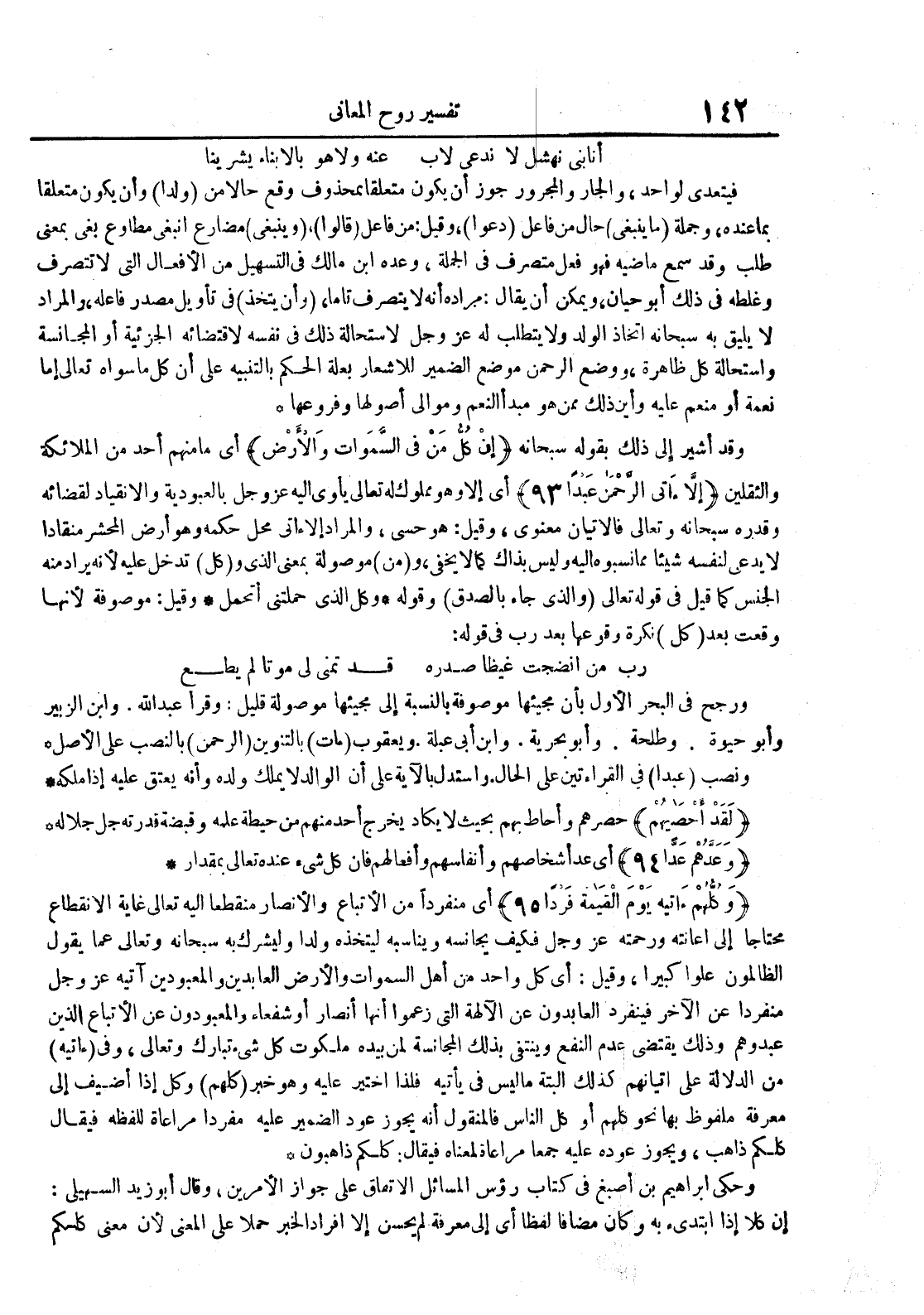 - أي إلا وهو مملوك له تعالى ياوى اليه عز و جل بالعبودية والانقياد لقضائه وقدره سبحانه وتعالى فالاتيان معنوى وقيل : هو حسى والمراد إلا ماتى محل حكمه وهو ارض المحشر منقادا لا يدعى لنفسه شيئا مما نسبوه اليه وليس بذاك كما لا يخفى و من موصولة بمعنى الذي و كل تدخل عليه لأنه يراد منه الجنس كما قيل في قوله تعالى والذي جاذ بالصدق وقوله