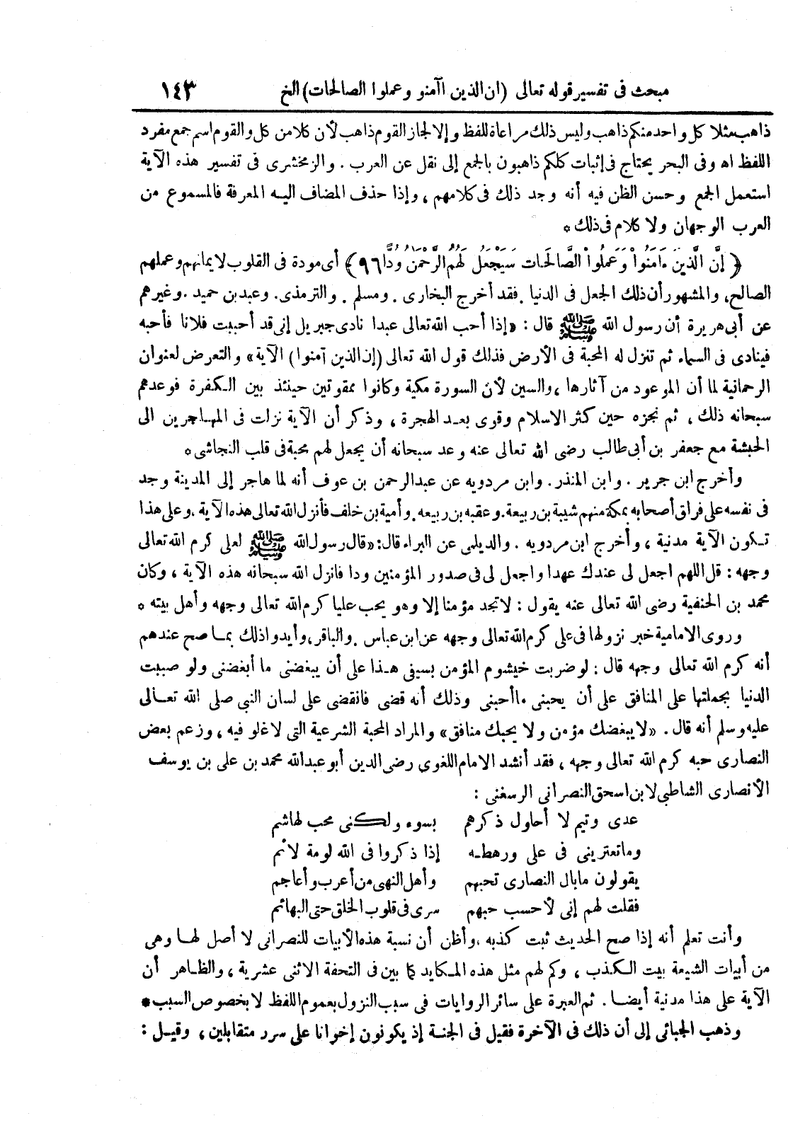 وروى الامامية خبر نزولها في على كرم الله تعالى وجهه عن ابن عباس والباقر وايدوا ذلك بما صح عندهم أنه كرم الله تعالى وجهه قال : لو ضربت خيشوم المؤمن بسيفى هذا على أن يبغضنى ما ابغضنى ولو صببت الدنيا بجملتها على المنافق على أن يحبنى ما احبنى وذلك أنه قضى فانقضى على لسان النبى صلى الله تعالى عليه وسلم أنه قال : لا يبغضك مؤمن ولا يحبك منافق والمراد المحبة الشرعية التي لا غلو فيه وزعم بعض النصارى حبه كرم الله تعالى وجهه فقد انشد الأمام اللغوى رضى الدين أبو عبد الله محمد بن على بن يوسف الانصارى الشاطى لابن اسحق النصرانى الرسغنى : عدى وتيم لا احاول ذكرهم بسوء ولكنى محب لهاشم وما تعترينى في على ورهطه إذا ذكروا في الله لومة لائم يقولون مابال النصارى تحبهم وأهل النهى من اعرب واعاجم فقلت لهم انى لاحسب حبهم سرى في قلوب الخلق حتى البهائم وانت تعلم أنه إذا صح الحديث ثبت كذبه واظن أنه نسبة هذه الأبيات للنصرانى لا اصل لها وهى من ابيات الشيعة بيت الكذب وكم لهم مثل هذه المكايد كما بين في التحفة الاثنى عشرية والظاهر أن الآية على هذا مدنية ايضا ثم العبرة على سائر الروايات في سبب النزول بعموم اللفظ لا بخصوص السبب