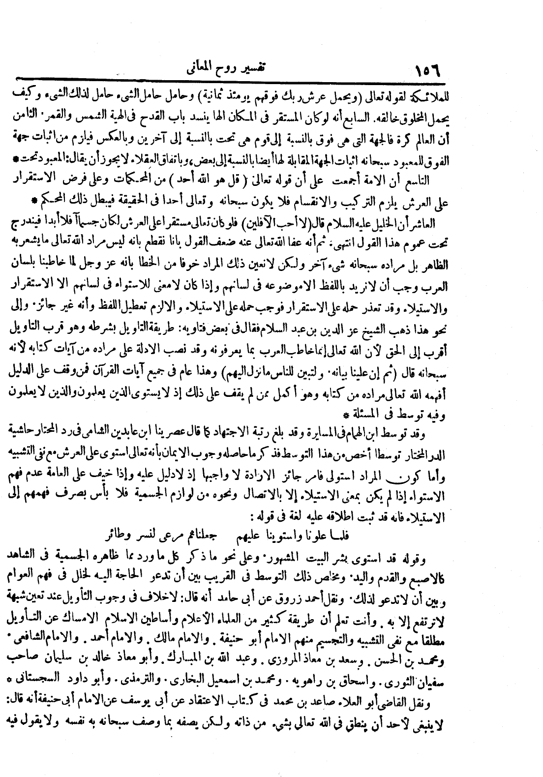 وقد توسط ابن الهمام في المسليرة وقد بلغ رتبة الاجتهاد كما قال عصرينا ابن عابدين الشامى في رد المختار حاسية الدار المختار توسطا اخص من هذا التوسط فذكر ما حاصله وجوب الأيمان بأنه تعالى استوى على العرش مع نفى التشبيه وأما كون المراد استولى فأمر جائز الأرادة لا واجبها إذ لا دليل عليه وإذا خيف على العامة عدم فهم الاستواء إذا لم يكن بمعنى الأستلاء إلا بالاتصال ونحوه من لوازم الجسيمة فلا باس بصرف فهمهم إلى الاستيلاء فانه قد ثبت اطلاقه عليه لغة في قولع : فلما علونا واستوينا عليهم جعلناهم مرعى لنسر وطائر وقوله قد استوى بشر البيت المشهور وعلى نحو ما ذكر كل ما ورد مما ظاهره الجسيمة في الشاهد كالأصبع والقدم واليد ومخلص ذلك التوسط في القريب بين أن تدعو الحاجة اليه لخلل في فهم العوام وبين أن لا تدعو لذلك ونقل احمد زروق عن أبى حامد أنه قال : لا خلاف في وجوب التأويل عند تعين شبهة لا ترتفع إلا به وانت تعلم أن طريقة كثير من العلماء الأعلام واساطين الاسلام الامساك عن التأويل مطلقا مع نفى التشبيه والتجسيم منهم الأمام أبو حنيفة والأمام مالك والأمام احمد والأمام الشافعى ومحمد بن الحسن وسعد بن معاذ المروزى وعبد الله بن المبارك وأبو معاذ خالد بن سليمان صاحب سيفان الثورى واسحاق بن راهويه ومحمد بن اسمعيل البخارى والترمذى وأبو داود السجستانى