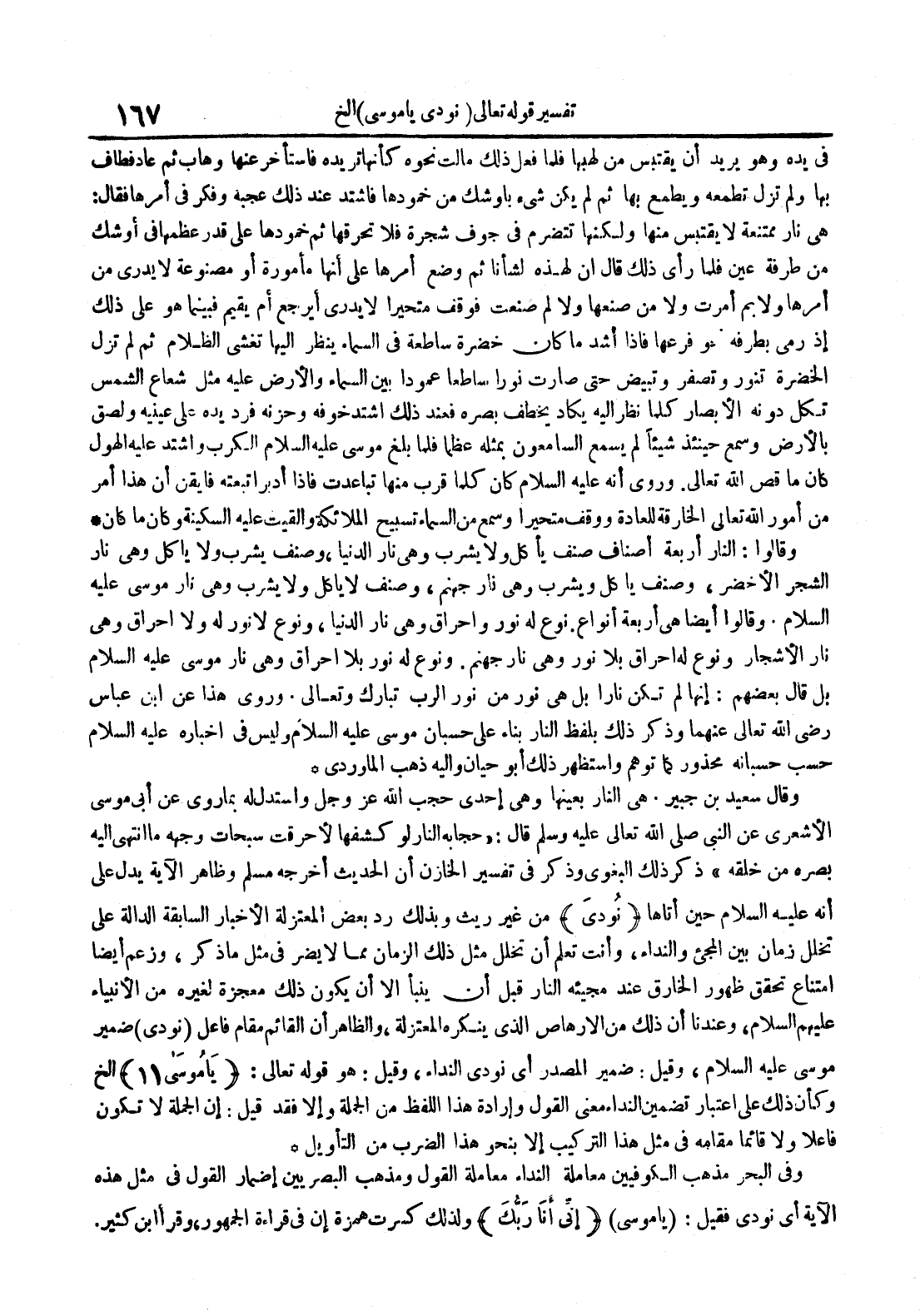 في يده وهو يريد أن يقتبس من لهبها فلما فعل ذلك مالت نحوه كأنها تريده فاستاخر عنها وهاب ثم عاد فطاف بها ولم تزل تكمعه ويطمع بها ثم لم يكن شئ باوشك من خمودها فاشتد عند ذلك عجبه وفكر في أمرها فقال : هي نار ممتنعة لا يقتبس منها ولكنها لتضرم في جوف شجرة فلا تحرقها ثم خمودها على قدر عظمها في اوشك من طرفة عين فلما رأى ذلك قال أن لهذه لشانا ثم وضع أمرها على أنها مامورة أو مصنوعة لا يدرى من أمرها ولا بم أمرت ولا من صنعها ولا لم صنعت فوقف متحيرا لا يدرى ايرجع ام يقيم فبينما هو على ذلك إذ رمى بطرفه نحو فرعها فاذا اشد ما كان خضرة ساطعة في السماء ينظر اليها تغشى الظلام ثم لم تزل الخضرة تنور وتصفر وتبيض حتى صارت نورا ساطعا عمودا بين السماء والارض عليه مثل شعاع الشمس يكل دونه الابصار كلما نظر اليه يكاد يخطف بصره فعند ذلك اشتد خوفه وحزنه فرد يده على عينيه ولصق بالارض وسمع حينئذ شيئا لم يسمع السامعون بمثله عظما فلما بلغ موسى عليه السلام الكرب واشتد عليه الهول كان ما قص الله تعالى وروى أنه عليه السلام كان كلما قرب منها تباعدت فاذا ادبر اتبعته فايقن أن هذا أمر من امور الله تعالى الخارقة للعادة ووقف متحيرا وسمع من السماء تسبيح الملائكة والقيت عليه السكينة وكان ما كان