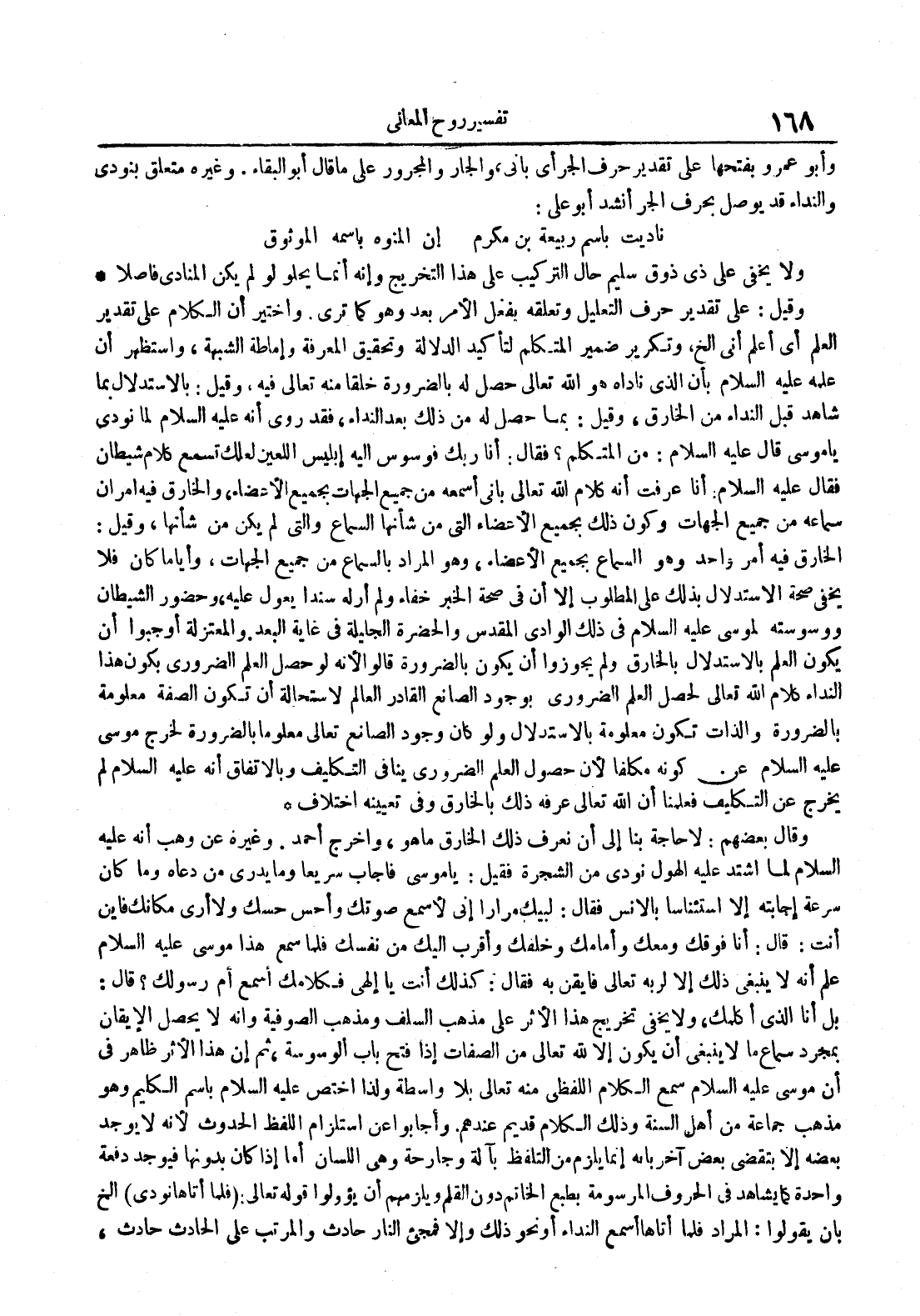 وقال بعضهم : لا حاجة بنا إلى أن نعرف ذلك الخالق ما هو وأخرج احمد وغيره عن وهب عليه السلام لما اشتدا عليه الهول نودى من الشجرة فقيل : يا موسى فاجاب سريعا وما يدرى من دعائه وما كان سرعة اجابته إلا استئناسا بالانس فقال : لبيك مرارا انى لاسمع صوتك واحس حسك ولا ارى مكانك فاين انت : قال : انا فوقك ومعك وامامك وخلفك واقرب اليك من نفسك فلما سمعى هذا موسى عليه السلام علم أنه لا ينبغى ذلك إلا لربه تعالى فأيقن به فقال : كذلك أنت يا إلهى فكلامك أسمع أم رسولك قال : بل انا الذي اكلامك ولا يخفى تخريج هذا الأثر على مذهب السلف ومذهب الصوفية وانه لا يحصل الإيقان بمجرد سماع مالا ينبغى أن يكون إلا لله تعالى من الصفات إذا فتح باب الوسوسة ثم أن هذا الأثر ظاهر في أن موسى عليه السلام سمع الكلام اللفظى منه تعالى بلا واسطه ولذا اختص عليه السلام باسم الكريم وهو مذهب جماعه من أهل السنة وذلك الكلام قديم عندهم واجابوا عن استلزام اللفظ الحدوث لأنه لا يوجد بعضه إلا بتقضى بعض آخر بأنه إنما يلزم من التلفظ بآلة وجارحة وهى اللسان أما إذا كان بدونها فيوجد دفعه واحدة وما يشاهد في الحروف الموسومة بطبع الخاتم دون القلم ويلزمة أن يؤولوا قوله تعالى : فلما اتاها نودى الخ بأن يقولوا : المراد فلما أتاها أسمع النداء أو نحو ذلك ولا فمجئ النار حادث والمرتب على الحادث حادث