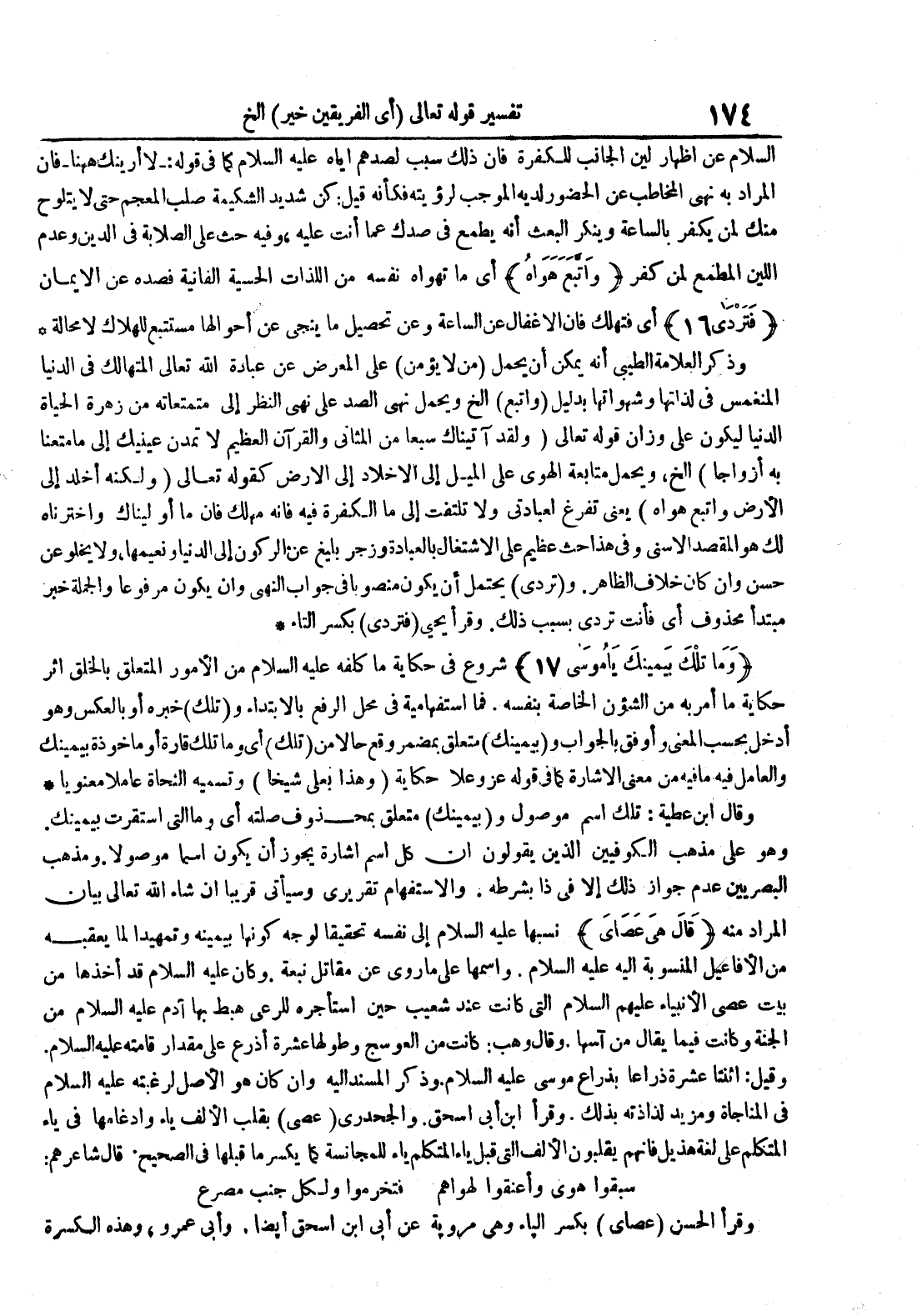 وقال ابن عطية : تلك اسم موصول و بيمينك متعلق بمحذوف صلته أي وما التى استقرت بيمينك وهو على مذهب الكوفيين الذين يقولون أن كل اسم اشارة يجوز أن يكون اسما موصولا ومذهب البصريين عدم جواز ذلك إلا فى ذا بشرطه والاستفهام تقريرى وسياتى قريبا أن شاء الله تعالى بيان المراد منه قال هى عصاى نسبها عليه السلام إلى نفسه تحقيقا لوجه كونها بيمينه وتمهيدا لما يعقبه من الأفاعيل المنسوبة اليه عليه السلام واسمها على ما روى عن مقاتل نبعة وكان عليه السلام قد اخذها من بيت عصى الأنبياء عليهم السلام التي كانت عند شعيب حين أستاجره للرعى هبط بها آدم عليه السلام من الجنة وكانت فيما يقال من اسهاوقال وهب : كانت من العوسج وطولها عشرة اذرع على مقدار قامته عليه السلاموقيل : اثنتا عشرة ذراعا بذراع موسى عليه السلام وذكر المسند اليه وان كان هو الأصل لرغبته عليه السلام في المناجاة ومزيد لذاذته بذلكوقرأ ابن أبى إسحق والجحدرى عصى بقلب الالف ياء وادغامها في ياء المتكلم على لغة هذيل فانهم يلبون الالف التي قبل ياء المتكلم ياء للمجانسة كما يكسر ماقبلها في الصحيح قال شاعرهم : سبقوا هوى واعنقوا لهواهم فتخرموا ولكل جنب مصرع وقرأ الحسن عصاى بكسر الياء وهي مروية عن أبى ابن اسحق أيضا وابى عمرووهذه الكسرة