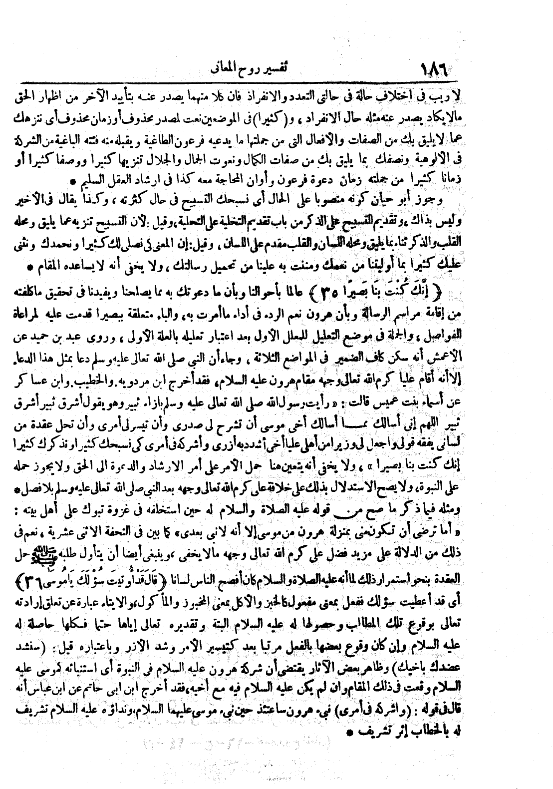 - عالما باحوالنا وبان ما دعوتك به مما يصلحنا ويفيدنا في تحقيق ما كلفته من اقامة مراسم الرسالة وبان هرون نعم الردء في اداء ما أمرت به والباء متعلقة ببصيرا قدمت عليه لمراعاة الفواصل والجملة في موضع التعليل للمعلل الأول بعد اعتبار تعليله بالعلة الأولى وروى عبد بن حميد عم الأعمش أنه سكن كاف الضمير في المواضع الثلاثة وجاء أن النبى صلى الله تعالى عليه وسلم دعا بمثل هذا الدعاء إلا أنه أقام عليا كرم الله تعالى وجهه مفام هرون عليه السلام فقد أخرج ابن مردميه والخطيب وابن عساكر عن اسماء بنت عميس قالت رايت رسول الله صلى الله تعالى عليه وسلم بازاء ثبير وهو يقول أشرق ثبير أشرق ثبير اللهم انى اسألك مما اسألك اخى موسى أن تشرح لى صدرى وان تيسر لى أمرى وان تحل عقدة من لسانى يفقه قولى واجعل لى وزيرا من اهلى عليا اخى أشدد به ازرى وأشركه في أمرى كى نسبحك كثيرا أو نذكرك كثيرا انك كنت بنا بصيرا ولا يخفى أنه يتعين هنا حمل الأمر على أمر الارشاد والدعوة إلى الحق ولا يجوز حمله على النبوة ولا يصح الاستدلال بذلك على خلاف علي كرم الله تعالى وجهه بعد النبى صلى الله تعالى عليه وسلم بلا فصل