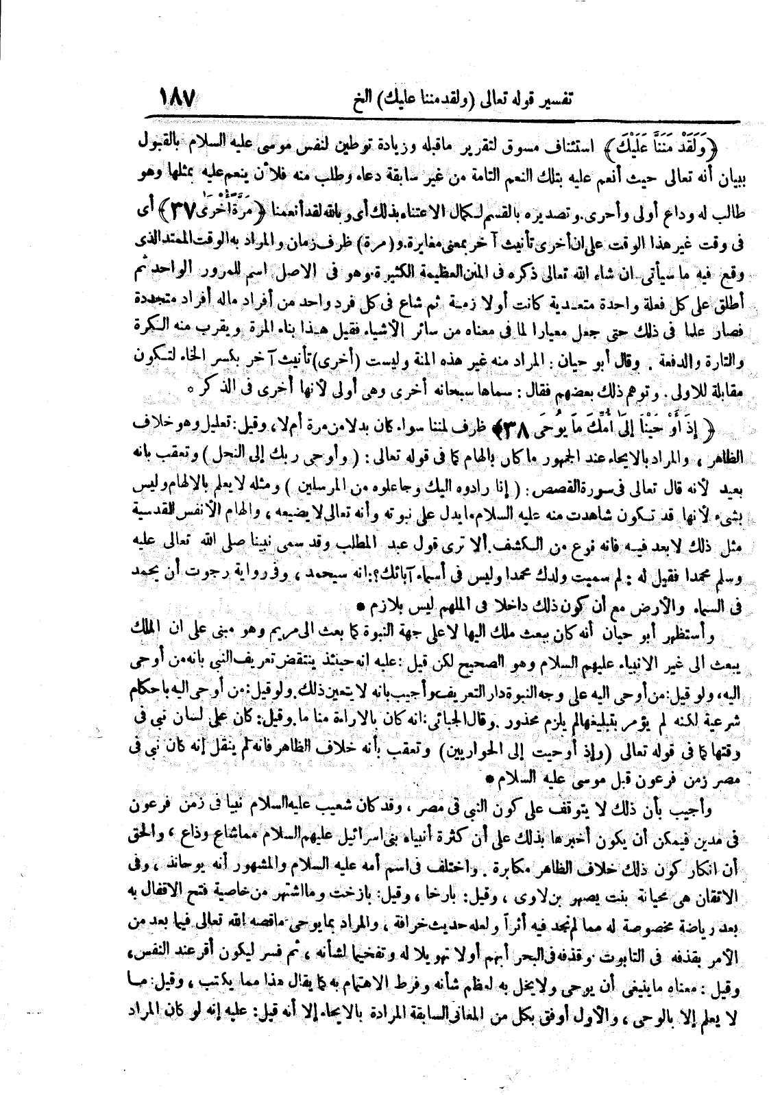 - ظرف لمننا سواء كان بدلا من مرة ام لا وقيل : تعليل وهو خلاف الظاهر والمراد بالايحاء عند الجمهور ما كان بالهاء كما في قوله تعالى : وأوحى ربك إلى النحل وتعقب بأنه بعيد لأنه قال تعالى في سورة القصص : انا رادوه اليك وجاعلوه من المرسلين ومثله لا يعلم بالالهام وليس بشئ لأنها قد تكون شاهدت منه عليه السلام ما يدل على نبوته وانه تعالى لا يضيعه والهام الأنفس القدسية مثل ذلك لا بعد فيه فانه نوع من الكشف إلا ترى قول عبد المطلب وقد سمى نبينا صلى الله تعالى عليه وسلم محمدا فقيل له : لم سميت ولدك محمدا وليس من اسماء ابائك : أنه سيحمد وفى رواية زجوت أن محمد في السماء والأرض مع أن كون ذلك داخلا فى الملهم ليس بلازم