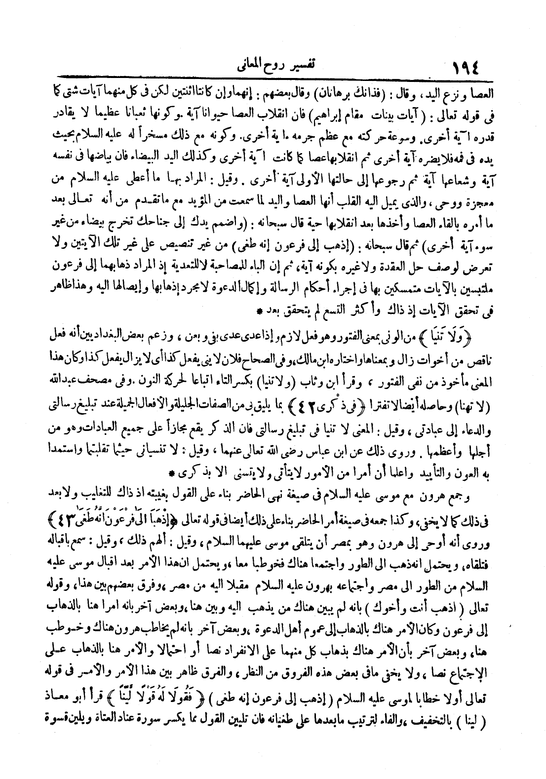 - وروى أنه أوحى إلى هرون وهو بمصر أن يتلقى موسى عليهما السلام وقيل : الهم ذلك وقيل : سمع باقباله فتلقاه ويحتمل أنه ذهب إلى الطور واجتمعا هناك فخوطبا معا ويحتمل أن هذا الأمر بعد اقبال موسى عليه السلام من الطور إلى مصر واجتماعه بهرون عليه السلام مقبلا اليه من مصر وفوق بعضهم بين هذا وقوله تعالى اذهب انت واخوك بأنه لم يبين هناك من يذهب اليه وبين هنا وبعض أخر بأنه أمرا هنا بالذهاب إلى فرعون وكان الأمر هناك بالذهاب إلى عموم أهل الدعوة وبعض أخر بأنه لم يخاطب هرون هناك وخوطب هنا وبعض أخر بأن الأمر هناك بذهاب كل منهما على الأنفراد نصا أو احتمالا والأمر هنا بالذهاب على الاجتماع نصا ولا يخفى ما في بعض هذه الفروق من النظر والفرق ظاهر بين هذا الأمر والأمر في قوله تعالى اولا خاطابا لموسى عليه السلام اذهب إلى فرعون أنه طغى فقولا له قولا لينا قرا أبو معاذ لينا بالتخفيف والفاء لترتيب ما بعدها على طغيانه فان تليين القول مما يكسر سورة عناد العتاة ويلين قسوة