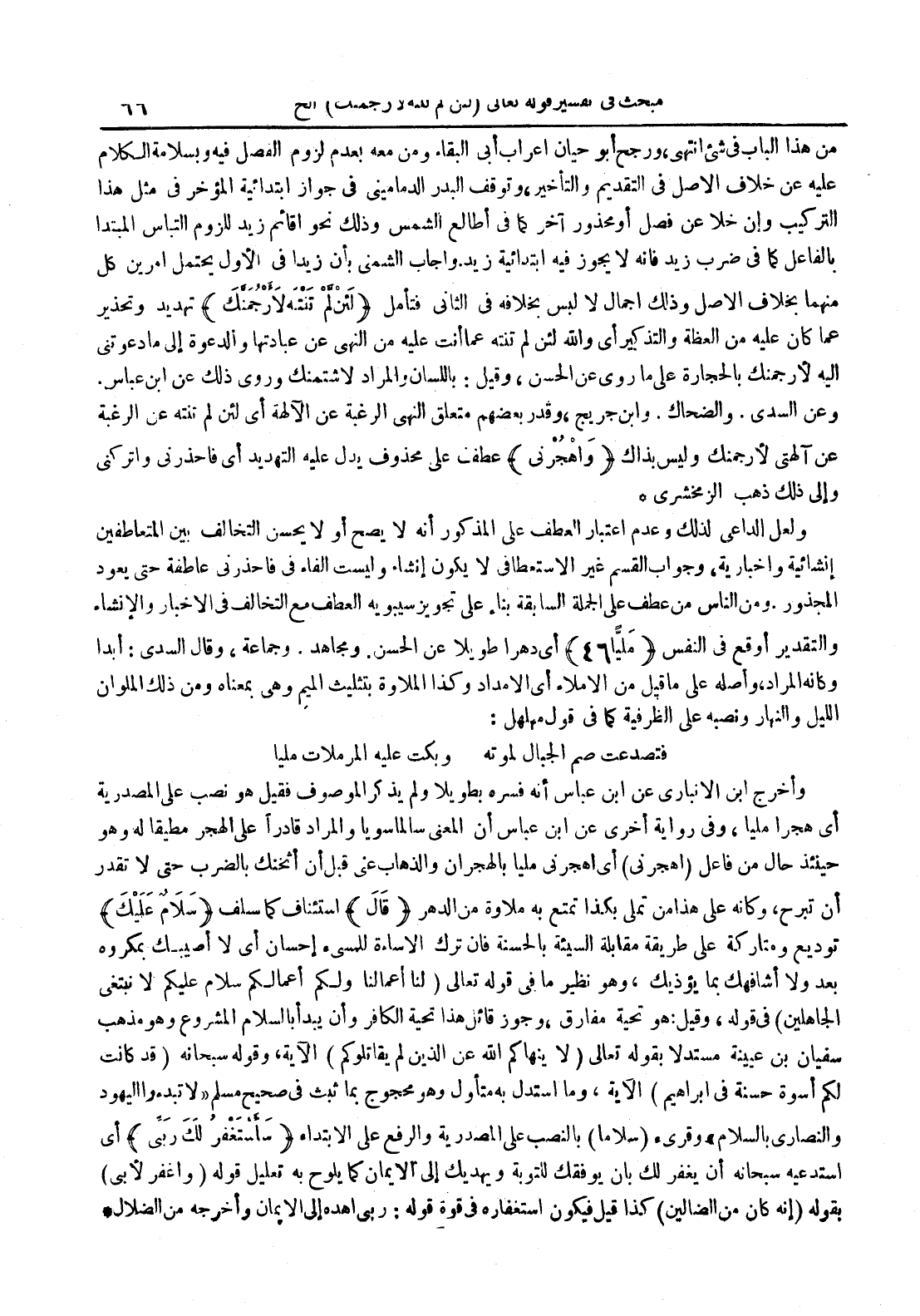 من هذا الباب في شيئ انتهى ورجح أو حيان اعراب أبى البقاء ومن معه بعدم لزوم الفصل فيه وبسلامة الكلام عليه عن خلاف الأصل في التقديم والتاخير وتوقف البدر الدماميني في جواز ابتدائية المؤخر في مثل هذا التركيب وان خلا عن فصل أو محذور آخر كما في اطالع الشمس وذلك نحو اقائم زيد للزوم التباس المبتدأ بالفاعل كما في ضرب زيد فانه لا يجوز فيه ابتدائية زيد واجاب الشمنى بأن زيدا في الأول يحتمل أمرين كل منهما بخلاف الأصل وذلك اجمال لا لبس بخلافه في الثاني فتأمل لئن لم تنته لارجمنك تهديد وتحذير عما كان عليه من العظة والتذكير أي والله لئن لم تنته عما انت عليه من النهي عن عبادتها والدعوة إلى ما دعوتني اليه لأرجمنك بالحجارة على ما روى عن الحسن وقيل : باللسان والمراد لاشتمنك وروى ذلك عن ابن عباس وعن السدى والضحاك وابن جريج وقدر بعضهم متعلق النهي الرغبه عن الآلهه أي لئن لم تنته عن الرغبه عن آلهتي لأرجمنك وليس بذاك واهجرنى عطف على محذوف يدل عليه التهديد أي فاحذرني واتركني والى ذلك ذهب الزمخشري