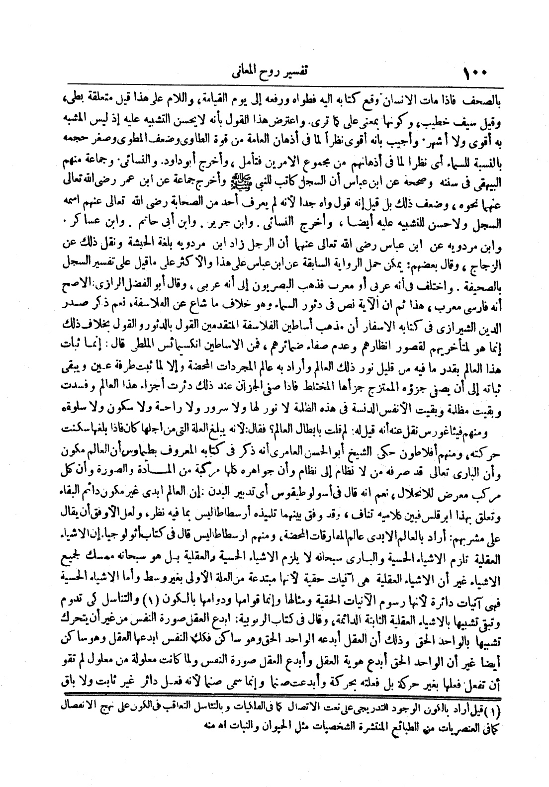 بالصحف فإذا مات الإنسان وقع كتابه إليه فطواه ورفعه إلى يوم القيامة واللام على هذا قيل متعلقة بطي وقيل سيف خطيب وكونها بمعنى على كما ترى واعترض هذا القول بأنه لا يحسن التشبيه عليه إذ ليس المشبه به أقوى ولا أشهر وأجيب بأنه أقوى نظرا لما في أذهان العامة من قوة الطاوي وضعف المطوي وصغر حجمه بالنسبة للسماء أي نظرا لما في أذهانهم من مجموع الأمرين فتأمل وأخرج أبو داود والنسائي وجماعة منهم البيهقي في سننه وصححه عن ابن عباس أن السجل كاتب للنبي صلى الله عليه و سلم وأخرج جماعة عن ابن عمر رضي الله تعالى عنهما نحوه وضعف ذلك بل قيل إنه قول واه جدا لأنه لم يعرف أحد من الصحابة رضي الله تعالى عنهم اسمه السجل ولا حسن للتشبيه عليها أيضا وأخرج النسائي وابن جرير وابن أبي حاتم وابن عساكر وابن مردوية عن ابن عباس رضي الله تعالى عنهما أن الرجل زاد ابن مردوية بلغة الحبشة ونقل ذلك عن الزجاج وقال بعضهم : يمكن حمل الرواية السابقة عن ابن عباس على هذا والأكثر على ما قيل على تفسير السجل بالصحيفة واختلف في أنه عربي أو معرب فذهب البصريون إلى أنه عربي وقال أبو الفضل الرازي : الأصح أنه فارسي معرب هذا ثم أن الآية نص في دثور السماء وهو خلاف ما شاع عن الفلاسفة نعم ذكر صدر الدين الشيرازي في كتابه الأسفار أن مذهب أساطبن الفلاسفة المتقدمين القول بالدثور والقول بخلاف ذلك إنما هو لمتأخريهم لقصور أنظارهم وعدم صفاء ضمائرهم فمن الأساطين انكسيمائس الملطي قال : إنما ثبات هذا العالم بقدر ما فيه من قليل نور ذلك العالم وأراد به عالم المجردات المحضة وإلا لما ثبت طرفة عين ويبقى ثباته إلى أن يصفي جزؤه الممتزج جزأها المختلط فإذا صفى الجزآن عند ذلك دثرت أجزاء هذا العالم وفسدت وبقيت مظلمة وبقيت الأنفس الدنسة في هذه الظلمة لا نور لها ولا سرور ولا راحة ولا سكون ولا سلوة