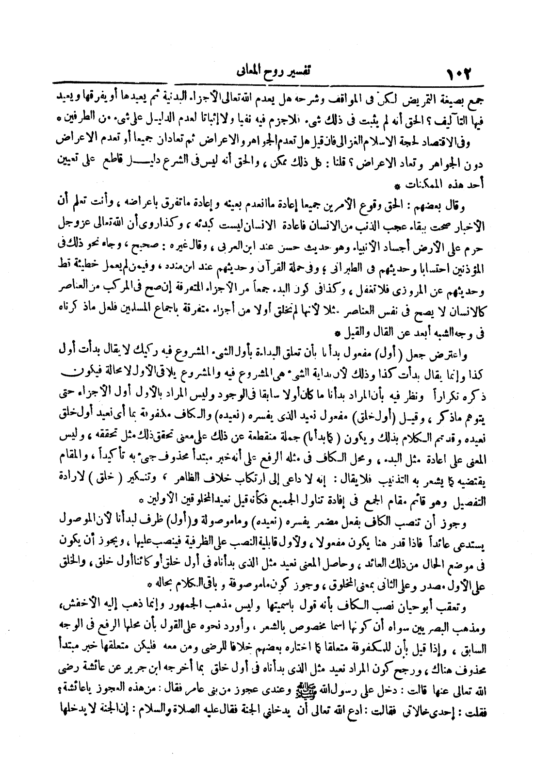 وقال بعضهم : الحق وقوع الأمرين جميعا إعادة ما انعدم بعينه وإعادة ما تفرق بإعراضه وأنت تعلم أن الأخبار صحت ببقاء عجب الذنب من الإنسان فإعادة الإنسان ليست كبدئه وكذا روي أن الله تعالى عز و جل حرم على الأرض أجساد الأنبياء وهو حديث حسن عند ابن العربي وقال غيره : صحيح وجاء نحو ذلك في المؤذنين احتسابا وحديثهم في الطبراني وفي حملة القرآن وحديثهم عند ابن منده وفيمن لم يعمل خطيئة قط وحديثهم عن المروزي فلا تفعل وكذا في كور البدء جمعا من الأجزاء المتفرقة إن صح في المركب من العناصر كالإنسان لا يصح في نفس العناصر مثلا لأنها لم تخلق أولا من أجزاء متفرقة بإجماع المسلمين فلعل ما ذكرناه في وجه الشبه أبعد عن القال والقيل