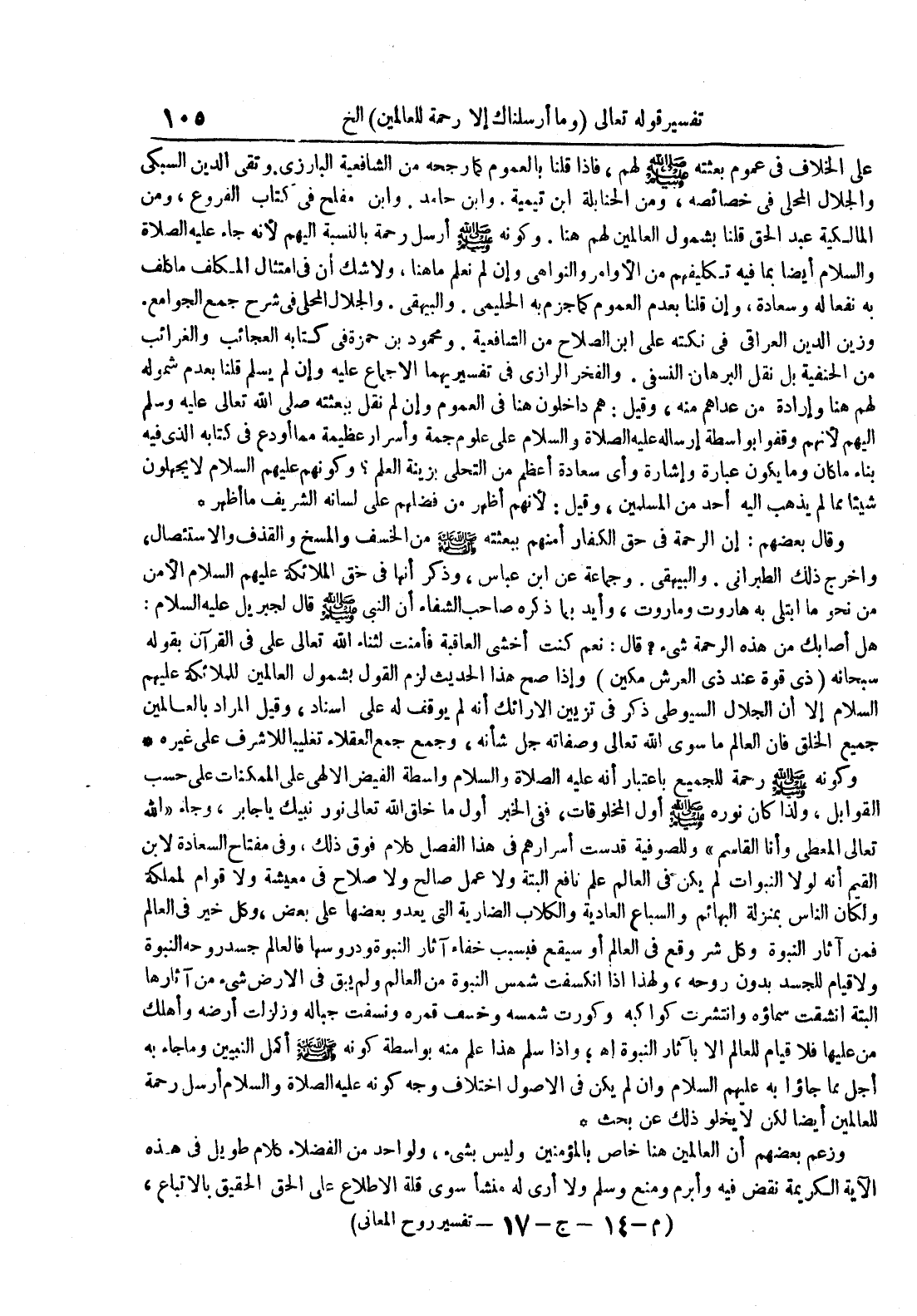 على الخلاف في عموم بعثته صلى الله عليه و سلم لهم فإذا قلنا بالعموم كما رجحه من الشافعية البارزي وتقي الدين السبكي والجلال المحل في خصائصه ومن الحنابلة ابن تيمية وابن حامد وابن مفلح في كتاب الفروع ومن المالكية عبد الحق قلنا بشمول العلمين لهم هنا وكونه صلى الله عليه و سلم أرسل رحمة بالنسبة إليهم لأنه جاء عليه الصلاة و السلام أيضا بما فيه تكليفهم من الأوامر والنواهي وإن لم نعلم ما هنا ولا شك أن في امتثال المكلف ما كلف به نفعا له وسعادة وإن قلنا بعدم العموم كما جزم به الحليمي والبيهقي والجلال المحلي في شرح جمع الجوامع وزين الدين العراقي في نكته على ابن الصلاح من الشافعية ومحمود بن حمزة في كتابه العجائب والغرائب من الحنفية بل نقل البرهان النسفي والفخر الرازي في تفسيريهما الإجماع عليه وإن لم يسلم قلنا بعدم شموله لهم هنا وإرادة من عداهم منه وقيل : هم داخلون هنا في العموم وإن لم نقل ببعثته صلى الله تعالى عليه وسلم إليهم لأنهم وقفوا بواسطة إرسال عليه الصلاة و السلام على جمة أسرار عظيمة مما أودع في كتابه الذي فيه بناء ما كان وما يكون عبارة وإشارة وأي سعادة أعظم من التحلي بزينة العلم وكونهم عليهم السلام لا يجهلون شيئا مما لم يذهب إليه أحد من المسلمين وقيل : لأنهم أظهر من فضلهم على لسانه الشريف ما أظهر