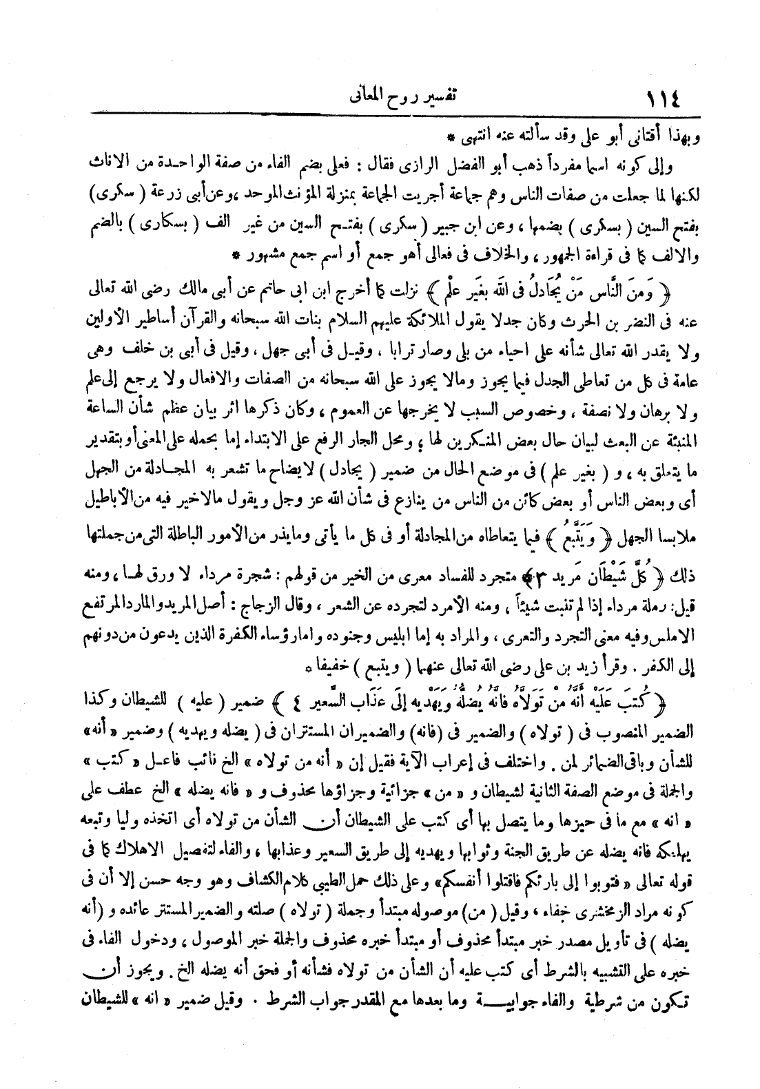 - ضمير عليه للشيطان وكذا الضمير المنصوب في تولاه والضمير في فإنه والضميران المستتران في يضله ويهديه وضمير إنه للشأن وباقي الضمائر لمن واختلف في إعراب الآية فقيل إن إنه من تولاه الخ نائب فاعل كتب والجملة في موضع الصفة الثانية لشيطان و من جزائية وجزاؤها محذوف و فإنه يضله الخ عطف على أنه مع ما في حيزها وما يتصل بها أي كتب على الشيطان أن الشأن من تولاه أي اتخذه وليا وتبعه يهلكه فإنه يضله عن طريق الجنة وثوابها ويهديه إلى طريق السعير وعذابها والفاء لتفصيل الإهلاك كما في قوله تعالى فتوبوا إلى بارئكم فاقتلوا أنفسكم وعلى ذلك حمل الطيبي كلام الكشاف وهو وجه حسن إلا أن في كونه مراد الزمخشري خفاء وقيل من موصوله مبتدأ وجملة تولاه صلته والضمير المستتر عائده و أنه يضله في تأويل مصدر خبر مبتدأ محذوف أو مبتدأ خبره محذوف والجملة خبر الموصول ودخول الفاء في خبره على التشبيه بالشرط أي كتب عليه أن الشأن من تولاه فشأنه أو فحق أنه يضله الخ ويجوز أن تكون من شرطية والفاء جوابية وما بعدها مع المقدر جواب الشرط وقيل ضمير إنه للشيطان