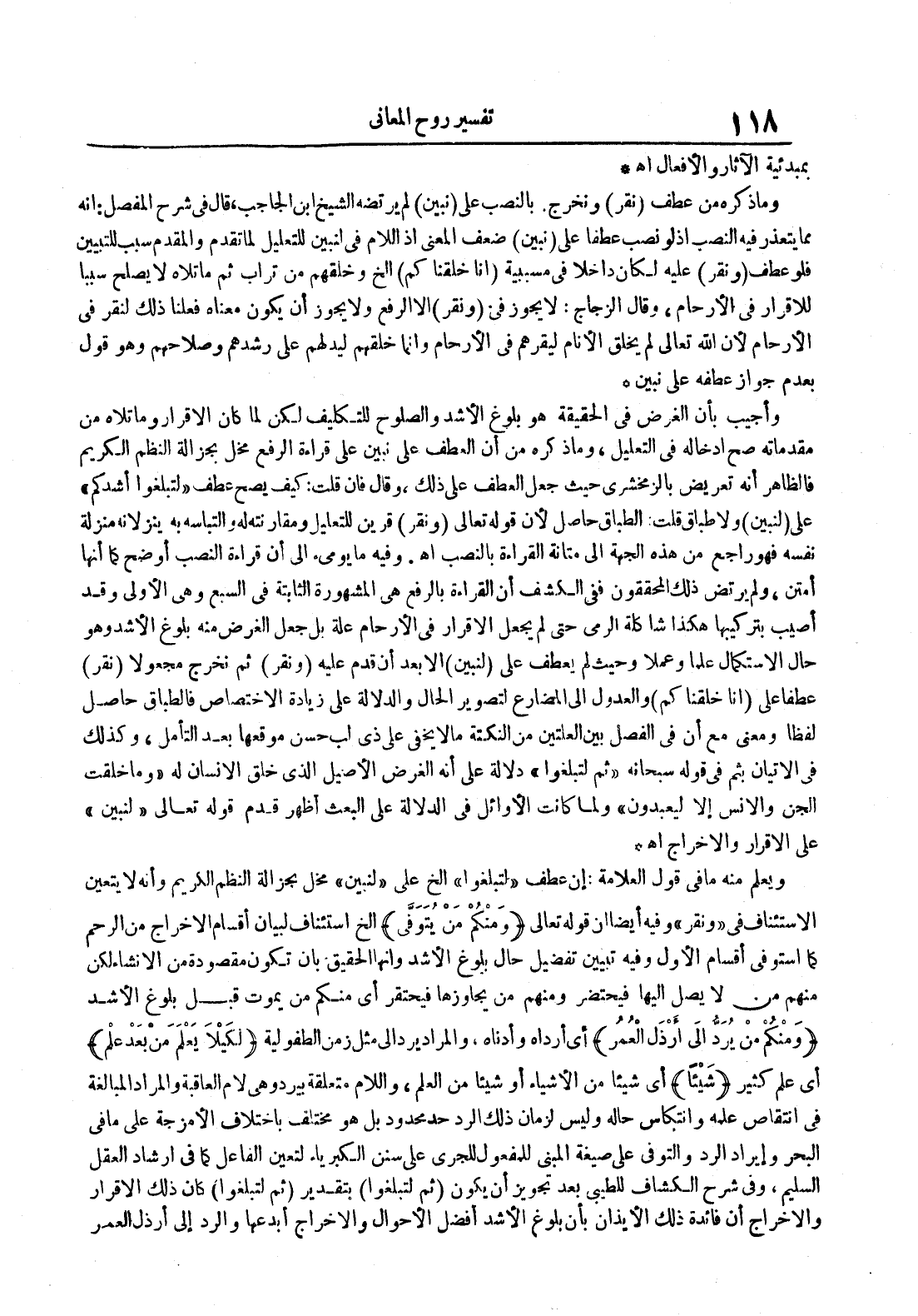 ويعلم منه ما في قول العلامة : إن عطف لتبلغوا الخ على لنبين مخل بجزالة النظم الكريم وأنه لا يتعين الإستئناف في ونقر وفيه أيضا أن قوله تعالى ومنكم من يتوفى الخ استئناف لبيان أقسام الإخراج من الرحم كما استوفى أقسام الأول وفيه تبيين تفضيل حال بلوغ الأشد وأنها الحقيق بأن تكون مقصودة من الإنشاء لكن منهم من لا يصل إليها فيتحضر ومنهم من يجاوزها فيحتقر أي منكم من يموت قبل بلوغ الأشد ومنكم من يرد إلى أرذل العمر أي أرداه وأدناه والمراد يرد إلى مثل زمن الطفولية لكيلا يعلم من بعد علم أي علم كثير شيئا أي شيئا من الأشياء أو شيئا من العلم واللام متعلقة بيرد وهي لام العاقبة والمراد المبالغة في النتقاص عمله وانتكاس حاله وليس لزمان ذلك الرد حد محدود بل هو مختلف باختلاف الأمزجة على ما في البحر وإيراد الرد والتوفي على صيغة المبني للمفعول للجري على سنن الكبرياء لتعين الفاعل كما في إرشاد العقل السليم وفي شرح الكشاف للطيبي بعد تجوز أن يكون ثم لتبلغوا بتقدير ثم لتبلغوا كان ذلك الإقرار والإخراج أن فائدة ذلك الإيذان بأن بلوغ الأشد أفضل الأحوال والإخراج أبدعها والرد إلى أرذل العمر