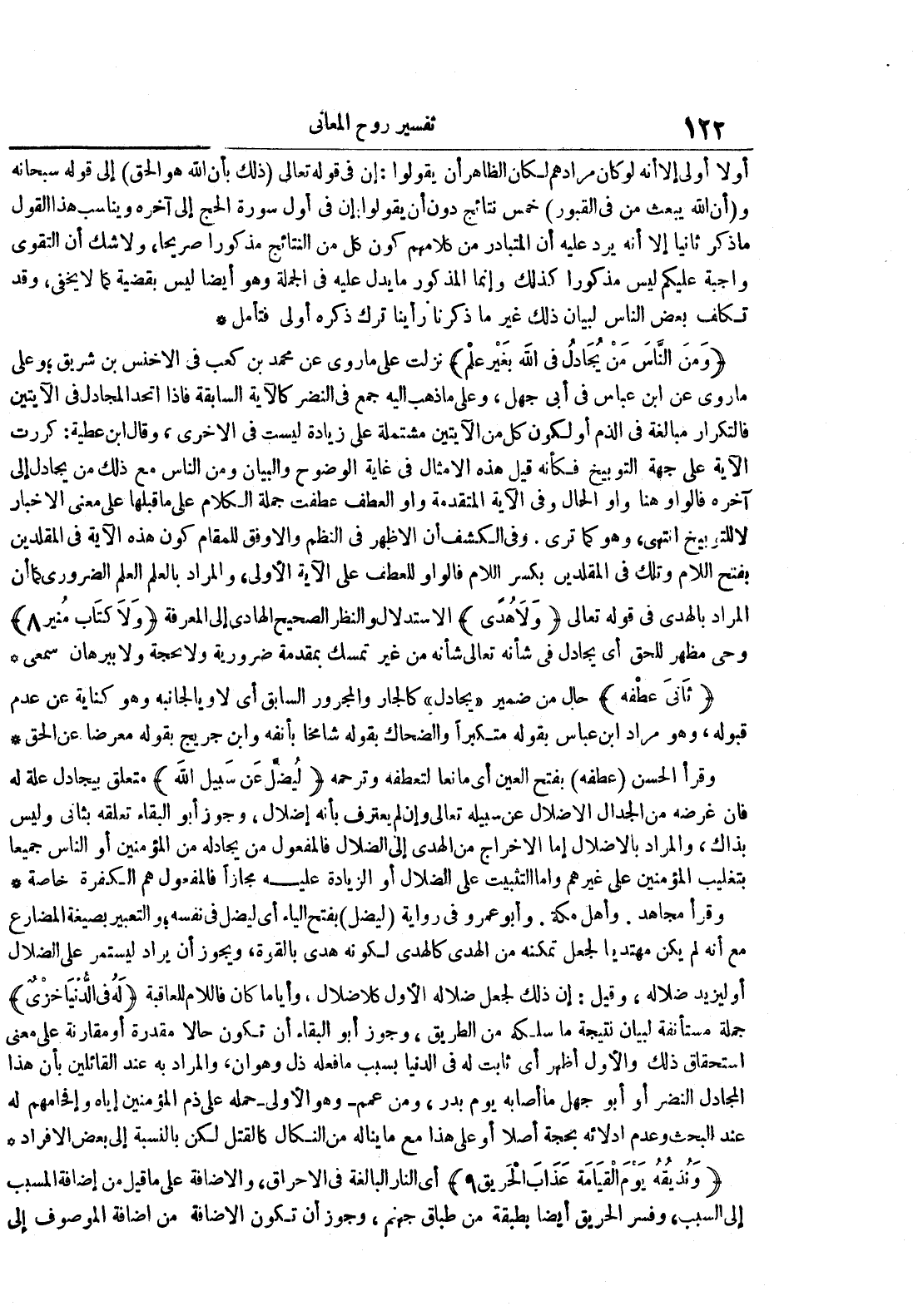 ومن الناس من يجادل في الله بغير علم نزلت على ما روي عن محمد بن كعب في الأخنس بن شريق وعلى ما روي عن ابن عباس في أبي جهل وعلى ما ذهب إليه جمع في النضر كالآية السابقة فإذا اتحد المجادل في الآيتين فالتكرار مبالغة في الذم أو لكون كل من الآيتين مشتملة على زيادة ليست في الأخرى وقال ابن عطية : كررت الآية على جهة التوبيخ فكأنه قيل هذه الأمثال في غاية الوضوح والبيان ومن الناس مع ذلك من يجادل إلى آخره فالواو هنا واو الحال وفي الآية المتقدمة واو العطف عطفت جملة الكلام على ما قبلها على معنى الإخبار لا للتوبيخ انتهى وهو كما ترى وفي الكشف أن الأظهر في النظم والأوفق للمقام كون هذه الآية في المقلدين بفتح اللام وتلك في المقلدين بكسر اللام فالواو للعطف على الآية الأولى والمراد بالعلم العلم الضروري كما أن المراد بالهدى في قوله تعالى ولا هدى الإستدلال والنظر الصحيح الهادي إلى المعرفة ولا كتاب منبر