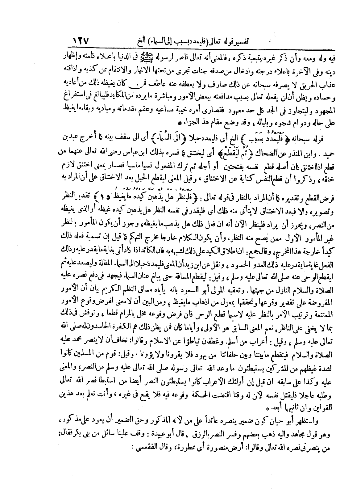 - تقدير النظر وتصويره وإلا فبعد الإختناق لا يتأتى منه ذلك أي فليقدر في نفسه النظر هل يذهبن كيده غيظه أو الذي يغيظه من النصر ويجوز أن يراد فلينظر الآن أنه إن فعل ذلك هل يذهب ما يغيظه وجوز أن يكون المأمور بالنظر غير المأمور الأول ممن يصح منه النظر وأن يكون الكلام خارجا مخرج التهكم كما قيل إن تسمية فعله ذلك كيدا خارجا هذا المخرج وقال جمع : إن إطلاق الكيد على ذلك لشبهه به فإن الكائد إذا كاد أتى بغاية ما يقدر عليه وذلك الفعل غاية ما يقدر عليه ذلك العدو الحسود ونقل عن ابن زيد أن المعنى فليمدد حبلا إلى السماء المظلة وليصعد عليه ثم ليقطع الوحي عنه صلى الله عليه و سلم وقيل : ليقطع المسافة حتى يبلغ عنان السماء فيجهد في دفع نصره عليه الصلاة و السلام النازل من جهتها وتعقبه المولى أبو السعود بأنه يأباه مسارق النظ الكريم بيان أن الأمور المفروضة على تقدير وقوعها وتحققها بمعزل من إذهاب ما يغيظ ومن البين أن لا معنى لفرض وقوع الأمور الممتنعة وترتيب الأمر بالنظر عليه لاسيما قطع الوحي فإن فرض وقوعه مخل بالمرام قطعا ونوقش في ذلك بما لا يخفى على الناظر نعم المعنى السابق هو الأولى وأياما كان فمن يظن ذلك هم الكفرة الحاسدون صلى الله تعالى عليه وسلم وقيل : أعراب من أسلم وغطفان تباطؤا عن الإسلام وقالوا : نخاف أن لا ينصر محمد عليه الصلاة و السلام فينقطع ما بيننا وبين حلفائنا من يهود فلا يقرونا ولا يؤونا وقيل : قوم من المسلمين كانوا لشدة غيظهم من المشركين يستبطئون ما وعد الله تعالة ورسوله صلى الله تعالى عليه وسلم من النصر والمعنى عليه وكذا على سابقه أن قيل إن أولئك الأعراب كانوا يستبطئون النصر أيضا من استبطأ نصر الله تعالى وطلبه عاجلا فليقتل نفسه لأن له وقتا اقتضت الحكمة وقوعه فيه فلا يقع في غيره وأنت تعلم بعد هذين القولين وأن ثانيهما أبعد