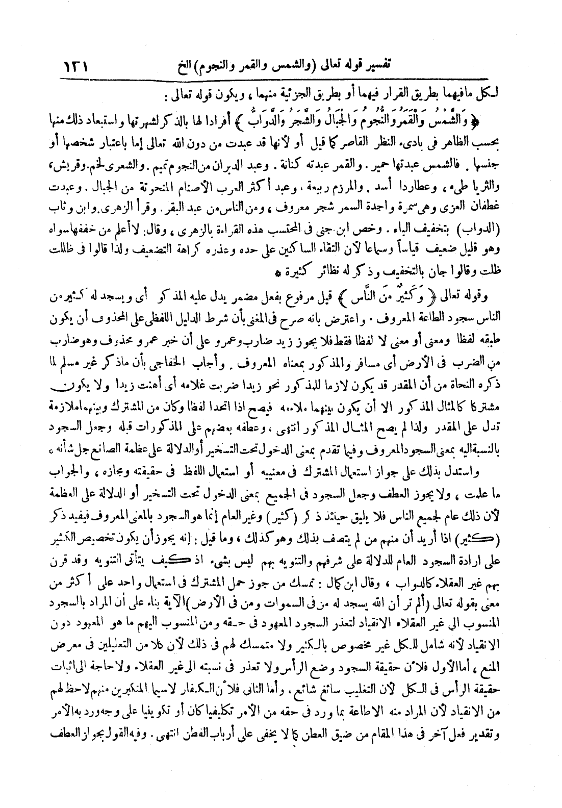 واستدل بذلك على جواز استعمال المشترك في معنييه أو استعمال اللفظ في حقيقته ومجازه والجواب ما علمت ولا يجوز العطف وجعل السجود في الجميع بمعنى الدخول تحت التسخير أو الدلالة على العظمة لأن ذلك عام لجميع الناس فلا يليق حينئذ ذكر كثير وغير العام إنما هو السجود بالمعنى المعروف فيفيد ذكر كثير إذا أريد أن منهم من لم يتصف بذلك وهو كذلك وما قيل : إنه يجوز أن يكون تخصيص الكثير على إرادة السجود العام للدلالة على شرفهم والتنويه بهم ليس بشيء إذ كيف يتأتى التنويه وقد قرن بهم غير العقلاء كالدواب وقال ابن كمال : تمسك من جوز حمل المشترك في استعمال واحد على أكثر من معنى بقوله تعالى ألم تر أن الله يسجد له من في السماوات ومن في الأرض الآية بناء على أن المراد بالسجود المنسوب إلى غير العقلاء الإنقياد لتعذر السجود المعهود في حقه ومن المنسوب إليهم ما هو المعهود دون الإنقياد لأنه شامل للكل غير مخصوص بالكثير ولا متمسك لهم في ذلك لأن كلا من التعليلين في معرض المنع أما الأول فلأن حقيقة السجود وضع الرأس ولا تعذر في نسبته إلى غير العقلاء ولا حاجة إلى إثبات حقيقة الرأس في الكل لأن التغليب سائغ شائع وأما الثاني فلأن الكفار لا سيما المتكبرين منهم لا حظ لهم من الإنقياد لأن المراد منه الإطاعة بما ورد في حقه من الأمر تكليفيا كان أو تكوينيا على وجه ورد به الأمر وتقدير فعل آخر في هذا المقام من ضيق الطعن كما لا يخفى على أرباب الفطن انتهى وفيه القول بجواز العطف