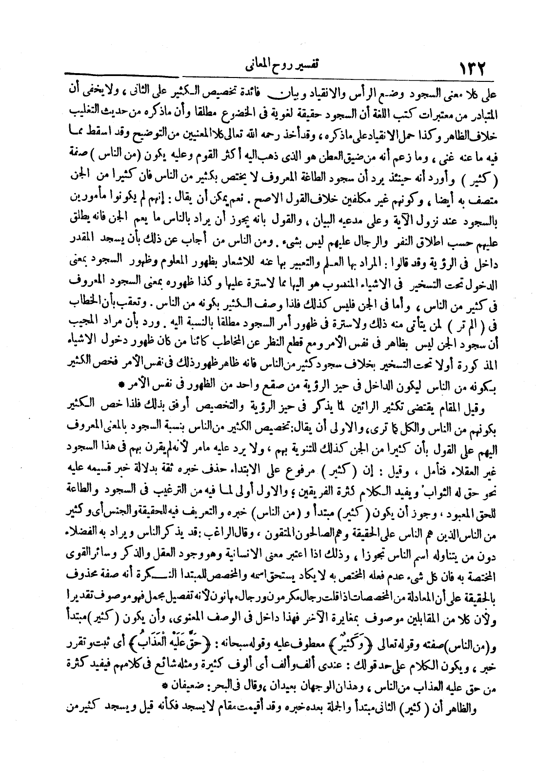 وقيل المقام يقتضي تكثير الرائين لما يذكر في حيز الرؤية والتخصيص أوفق بذلك فلذا خص الكثير بكونهم من الناس والكل كما ترى والأولى أن يقال : تخصيص الكثير من الناس بنسبة السجود بالمعنى المعروف إليهم على القول بأن كثيرا من الجن كذلك للتنويه بهم ولا يرد عليه ما مر لأنه لم يقرن بهم في هذا السجود غير العقلاء فتأمل وقيل : إن كثير مرفوع على الإبتداء حذف خبره ثقة بدلالة خبر قسميه عليه نحو حق الثواب ويفيد الكلام كثرة الفريقين والأول أولى لما فيه من الترغيب في السجود والطاعة للحق المعبود وجوز أن يكون كثير مبتدأ و من الناس خبره والتعريف فيه للحقيقة والجنس أي وكثير من الناس الذين هم الناس على الحقيقة وهم الصالحون المتقون وقال الراغب : قد يكون الناس ويراد به الفضلاء دون من يتناوله اسم الناس تجوزا وذلك إذا اعتبر معنى الإنسانية وهو وجود العقل والذكر وسائر القوى المختصة به فإن كل شيء عدم فعله المختص به لا يكاد يستحق اسمه والمخصص للمبتدأ النكرة أنه صفة محذوف بالحقيقة على أن المعادلة من المخصصات إذا قلت رجال مكرمون ورجال مهانون لأنه تفصيل مجمل فهو موصوف تقديرا ولأن كلا من المقابلين موصوف بمغايرة الآخر فهذا داخل في الوصف المعنوي وأن يكون كثيرا مبتدأ و من الناس صفته وقوله تعالى وكثير معطوف عليه وقوله سبحانه : حق عليه العذاب أي ثبت وتقرر خبر ويكون الكلام على حد قولك : عدني ألف وألف أي ألوف كثيرة ومثله شائع في كلامهم فيفيد كثرة من حق عليه العذاب من الناس وهذان الوجهان بعيدان وقال في البحر : ضعيفان