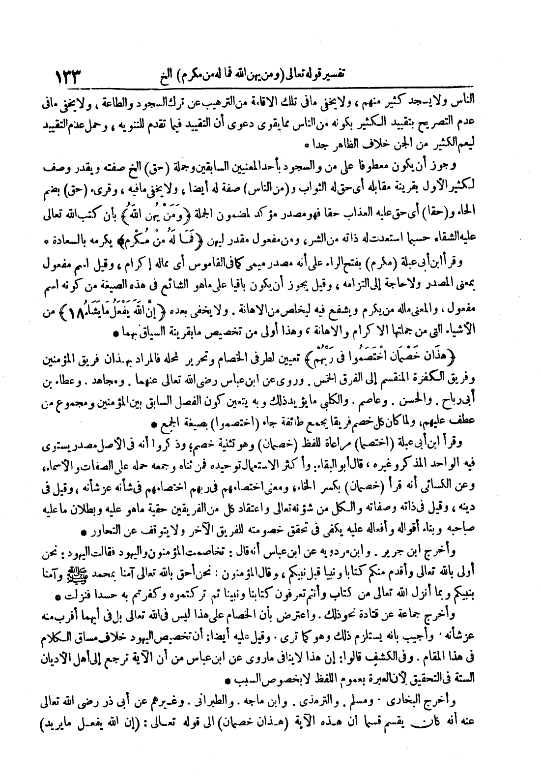 وأخرج البخاري ومسلم والترمذي وابن ماجة والطبراني وغيرهم عن أبي ذر رضي الله تعالى عنه أنه كان يقسم قسما أن هذه الآية هذان خصمان إلى قوله تعالى : إن الله يفعل ما يريد