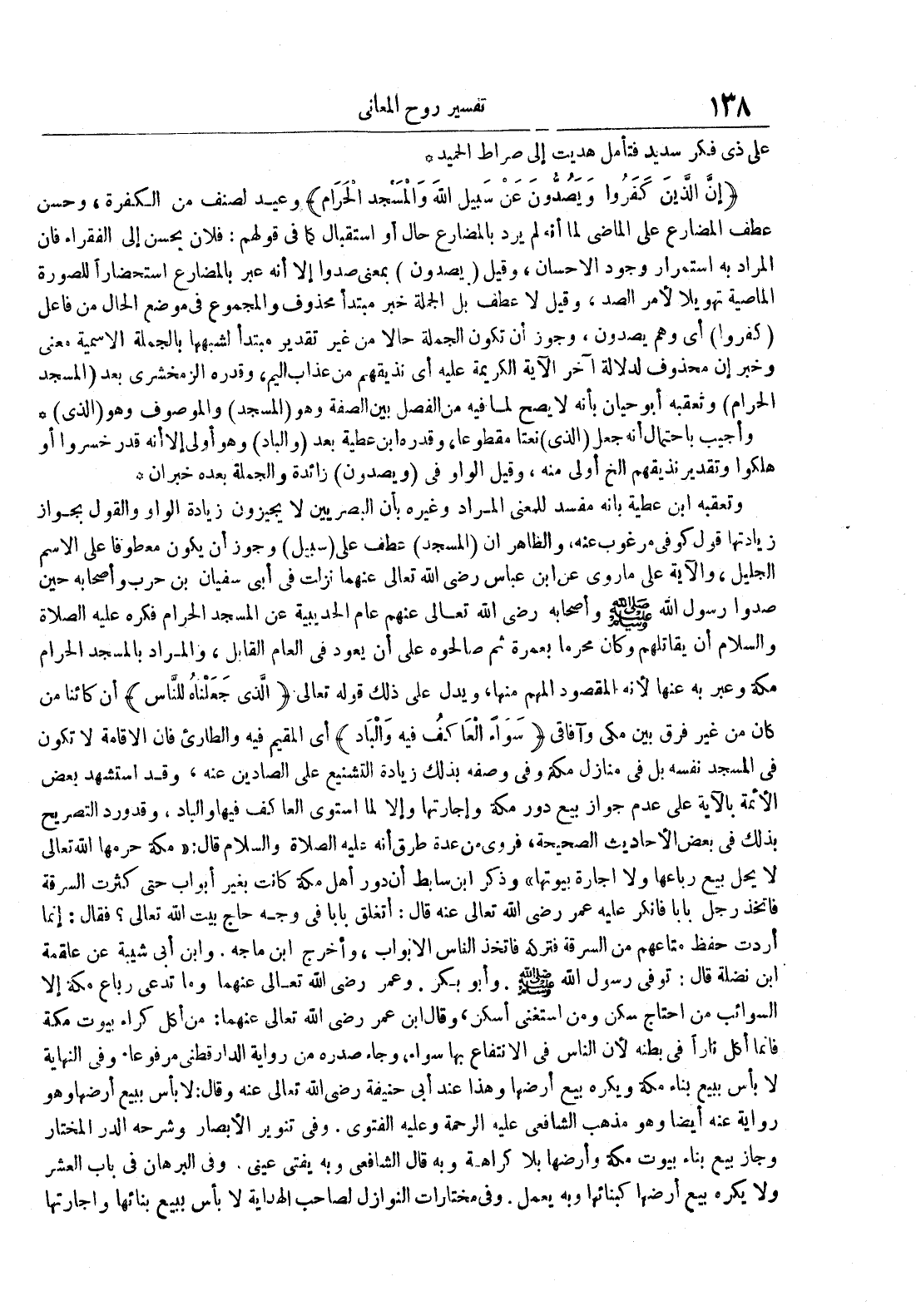 وتعقبه ابن عطية بأنه مفسد للمعنى المراد وغيره بأن البصريين لا يجيزون زيادة الواو والقول بجواز زيادتها قول كوفي مرغوب عنه والظاهر أن المسجد عطف على سبيل وجوز أن يكون معطوفا على الاسم الجليل والآية على ما روي عن ابن عباس رضي الله تعالى عنهما نزلت في أبي سفيان بن حرب وأصحابه حين صدوا رسول الله صلى الله عليه و سلم وأصحابه رضي الله تعالى عنهم عام الحديبية عن المسجد الحرام فكره عليه الصلاة و السلام أن يقاتلهم وكان محرما بعمرة ثم صالحوه على أن يعود في العام القابل والمراد بالمسجد الحرام مكة وعبر به عنها لأنه المقصود المهم منها ويدل على ذلك قوله تعالى الذي جعلناه للناس أي كائنا من كان من غير فرق بين مكي وآفاقي سواء العاكف فيه والبارد أي المقيم فيه والطاريء فإن الإقامة لا تكون في المسجد نفسه بل في منازل مكة وفي وصفه بذلك زيادة التشنيع عن الصادين عنه وقد استشهد بعض الأئمة بالآية على عدم جواز بيع دور مكة وإجارتها وإلا لما استوى العاكف فيها والبارد وقد ورد التصريح بذلك في بعض الأحاديث الصحيحة فروي من عدة طرق أنه عليه الصلاة و السلام قال : مكة حرمها الله تعالى لا يحل بيع رباعها ولا إجارة بيوتها وذكر ابن سابط أن دون أهل مكة كانت بغير أبواب حتى كثرت السرقة فاتخذ رجل بابا فأنكر عليه عمر رضي الله تعالى عنه قال : أتغلق بابا في وجه حاج بيت الله تعالى فقال : إنما أردت حفظ متاعهم من السرقة فتركه فاتخذ الناس الأبواب وأخرج ابن ماجة وابن أبي شيبة عن علقمة ابن نضلة قال : توفي رسول الله صلى الله عليه و سلم وأبو بكر وعمر رضي الله تعالى عنهما وما تعدى رباع مكة إلا السوائب من احتاج سكن ومن استغنى أسكن وقال ابن عمر رضي الله تعالى عنهما : من أكل كراء بيوت مكة قائما أكل نارا في بطنه لأن الناس في الإنتفاع بها سواء وجاء صدره من رواية الدارقطني مرفوعا وفي النهاية لا بأس ببيع بناء مكة ويكره بيع أرضها وهذا عند أبي حنيفة رضي الله تعالى عنه وقال : لا بأس ببيع أرضها وهو رواية عنه أيضا وهو مذهب الشافعي عليه الرحمة وعليه الفتوى وفي تنوير الأبصار وشرحه الدر المختار وجاز بيع بناء بيوت مكة وأرضها بلا كراهة وبه قال الشافعي وبه يفتى عيني وفي البرهان في باب العشر ولا يكره بيع أرضها كبنائها وبه يعمل وفي مختارات النوازل لصاحب الهداية لا بأس ببيع بنائها وإجارتها