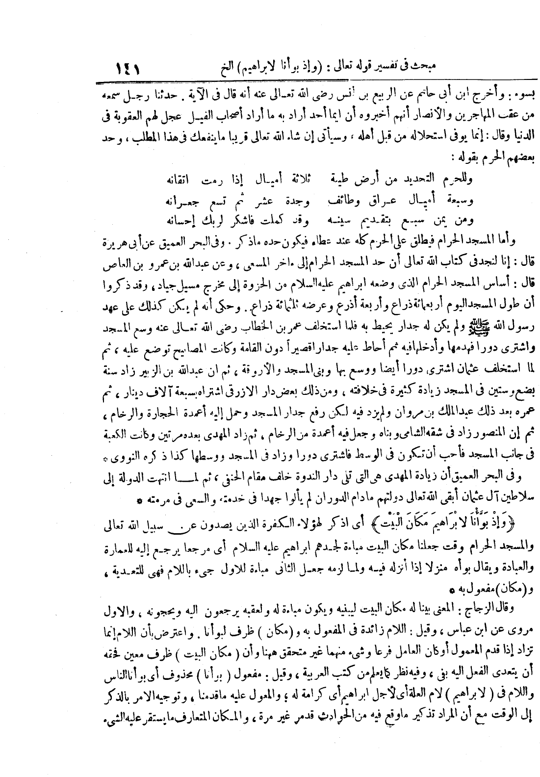 وقال الزجاج : المعنى بينا له مكان البيت ليبينه ويكون مباءة له ولعقبه يرجعون إليه ويحجونه والأول مروي عن ابن عباس وقيل : اللام زائدة في المفعول به و مكان ظرف لبوأنا واعترض بأن اللام إنما تزاد إذا قدم المعمول أو كان العامل فرعا وشيء منهما غير متحقق ههنا وأن مكان البيت ظرف معين فحقه أن يتعدى الفعل إليه بفي وفيه نظر كما يعلم من كتب العربية وقيل : مفعول بوأنا محذوف أي بوأنا الناس واللام في لإبراهيم لام العلة أي لأجل إبراهيم أي كرامة له والمعول عليه ما قدمنا وتوجيه الأمر بالذكر إلى الوقت مع أن المراد تذكير ما وقع فيه من الحوادث قد مر غير مرة والمكان المتعارف ويمنعه من النزول وللعلماء فيه مذاهب وليس هذا مكان تحقيقها وأصل البيت مأوى الإنسان بالليل ثم قد يقال من غير اعتبار الليل فيه وجمعه أبيات وبيوت لكن البيوت بالمسكن أخص والأبيات بالشعر أخص ويقع ذلك على المتخذ من حجر ومن مدر ومن صوف ووبر ويعبر عن مكان الشيء ببيته والمراد بالبيت بيت الله عز و جل الكعبة المكرمة وقد بنيت خمس مرات أحدها بناء الملائكة عليهم السلام قبل آدم وكانت من ياقوتة حمراء ثم رفع ذلك البناء إلى السماء أيام الطوفان والثانية لناء إبراهيم عليه السلام روي أنه تعالى لما أمره ببناء البيت لم يدر أين يبني فأرسل الله تعالى له الريح الخجوج فكشف عن أسه القديم فبنى عليه والثالثة بناء قريش في الجاهلية وقد حضره النبي صلى الله عليه و سلم وكان شابا فلما أرادوا أن يرفعوا الحجر الأسود اختصموا فيه فأراد كل قبيلة أن يتولى رفعه ثم توافقوا على أن يحكم بينهم أول رجل يخرج من هذه السكة فكان رسول الله صلى الله عليه و سلم أول من خرج فقضى بينهم أن يجعلوه في مرط ثم يرفعه جميع القبائل فرفعوه ثم ارتقى صلى الله عليه و سلم فرفعوه إليه فوضعه مكانه وكانوا يدعونه عليه السلام الأمين وكان ذلك قبل المبعث فيما قيل بخمس عشرة سنة والرابعة بناء عبد الله بن الزبير والخامسة بناء الحجاج وهو البناء الموجود اليوم وارتفاعها في السماء سبعة وعشرون ذراعا وربع ذراع والذراع أربع وعشرون أصبعا والأصبع ست شعيرات والشعيرة ست شعرات من شعر البرذون : وأما طولها في الأرض فمن الركن اليماني إلى الركن الأسود خمسة وعشرون ذراعا وكذا ما بين اليماني والغربي وأما عرضها فهو من الركن اليماني إلى الركن الأسود عشرون ذراعا وطول الباب ستة أذرع وعشرة أصابع وعرضه أربعة أذرع والباب في جدارها الشرقي وهو من خشب الساج مضبب بالصفائح من الفضة وارتفاع ما تحت عتبة الباب من الأرض أربعة أذرع وثلاث أصابع والميزاب في وسط جدار الحجر وعرض الملتزم وهو ما بين الباب والحجر الأسود أربعة أذرع وارتفاع الحجر الأسود من الأرض ثلاثة أذرع إلا سبعا وعرض القدر الذي بدر منه شبر وأربع أصابع مضمومة وعرض المستجاد وهو بين الركن اليماني إلى الباب المسدود في ظهر الكعبة مقابلا للملتزم أربعة أذرع وخمس أصابع وعرض الباب المسدود ثلاثة أذرع ونصف ذراع وطوله أكثر من خمسة أذرع وأما الحجر ويسمى الحطيم والحظيرة فعلى هيئة نصف دائرة من صوب الشام والشمال بين الركن العراقي والشامي وحده من جدار الكعبة الذي تحت الميزاب إلى جدار الحجر سبعة عشر ذراعا وثماني أصابع منها سبعة أذرع أو ستة وشبر من أرض الكعبة والباقي كان زربا لغنم سيدنا إسماعيل عليه السلام فأدخلوه في الحجر وما بين بابي الحجر عشرون ذراعا وعرض جدار الحجر ذراعان وذرع تدوير جدار الحجر من داخله ثمانية وثلاثون ذراعا ومن خارجه أربعون ذراعا وست أصابع وارتفاع جدار الحجر ذراعان فذرع الطوق وحده حوالي إلى الكعبة والحجر مائة ذراع وثلاثة وعشرون ذراعا واثنتا عشرة أصبعا وهذا على ما ذكره الإمام حسين بن محمد الآدمي في رسالة له في ذلك والعهدة عليه وأنا لنرجوا من رب البيت أن يوفقنا لزيارة بيته وتحقيق ذلك بلطفه وكرمه و أن في قوله تعالى أن لا تشرك بي شيئا قيل مفسرة والتفسير باعتبار أن التبوئة من أجل العبادة فكأنه قيل أمرنا إبراهيم عليه السلام بالعبادة وذلك فيه معنى القول دون حروفه أو 