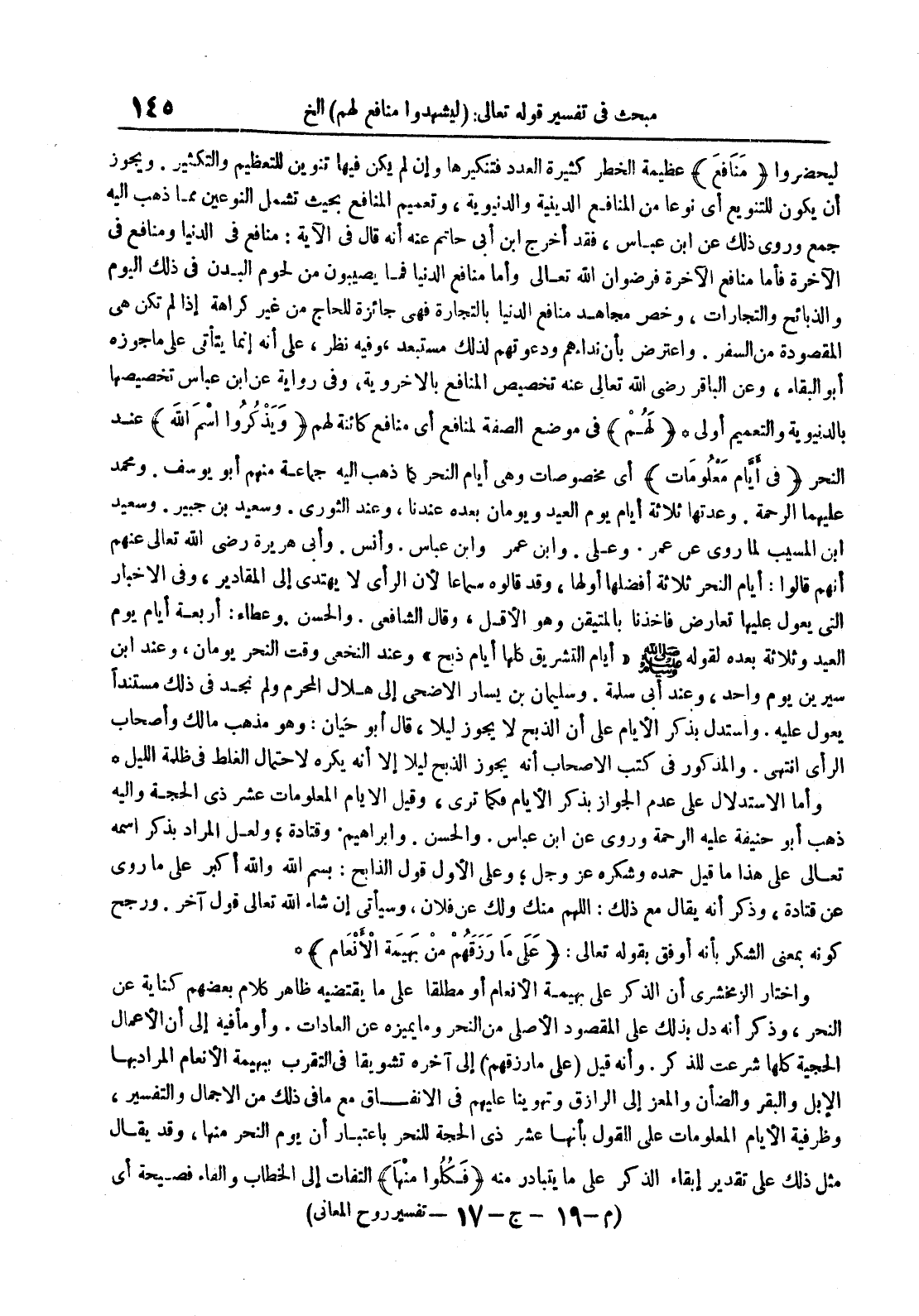 لهم في موضع الصفة لمنافع أي منافع كائنة لهم ويذكروا اسم الله عند النحر في أيام معلومات أي مخصوصات وهي أيام النحر كما ذهب إليه جماعة منهم أبو يوسف ومحمد عليهما الرحمة وعدتها ثلاثة أيام يوم العيد ويومان بعده عندنا وعند الثوري وسعيد بن جبير وسعيد ابن المسيب لما روي عن عمر وعلي وابن عمر وابن عباس وأنس وأبي هريرة رضي الله تعالى عنهم أنهم قالوا : أيام النحر ثلاثة أفضلها أولها وقد قالوه سماعا لأن الرأي لا يهتدي إلى المقادير وفي الأخبار التي يعول عليها تعارض فأخذنا بالمتيقن وهو الأقل وقال الشافعي والحسن وعطاء : أربعة أيام يوم العيد وثلاثة بعده لقوله صلى الله عليه و سلم أيام التشريق كلها أيام ذبح وعند النخعي وقت النحر يومان وعند أبي سيرين يوم واحد وعند أبي سلمة وسليمان بن يسار الأضحى إلى هلال المحرم ولم نجد في ذلك مستندا يعول عليه واستدل بذكر الأيام على أن الذبح لا يجوز ليلا قال أبو حيان : وهو مذهب مالك وأصحاب الرأي انتهى والمذكور في كتب الأصحاب أنه يجوز الذبح ليلا إلا أنه يكره لاحتمال الغلظ في ظلمة الليل