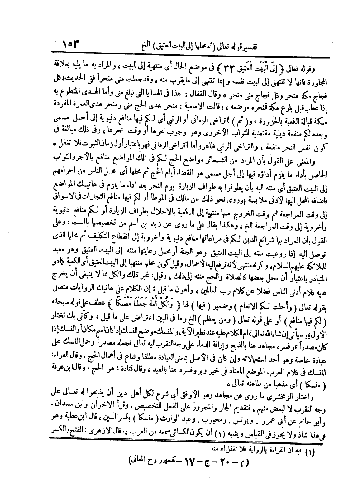 والمعنى على القول بأن المراد من الشعائر مواضع الحج لكم في تلك المواضع منافع بالأجر والثواب الحاصل بأداء ما يلزم أداؤه فيها إلى أجل مسمى وهو انقضاء أيام الحج ثم محلها أي محل الناس من أحرامهم إلى البيت العتيق أي منته إليه بأن يطوفوا به طواف الزيارة يوم النحر بعد أداء ما يلزم في هاتيك المواضع فأضافة المحل إليها لأدنى ملابسة وروي نحو ذلك عن مالك في الموطأ أو لكم فيها منافع التجارات في الأسواق إلة وقت المراجعة ثم وقت الخروج منها منتنهية إلى الكعبة بالإحلال بطواف الزيادة أو لكم منافع دنيوية وأخروية إلى وقت المراجعة الخ وهكذا يقال ما روى عن زيد بن أسلم من تخصيصها بالست وعلى القول بأن المراد بها شرائع الدين لكم في مراعاتها منافع دنيوية وأخروية إلى انقطاع التكليف ثم محلها الذي توصل إليه إذا روعيت منته إلى البيت العتيق وهو الجنة أو محل رعايتها منته إلى البيت العتيق وهو معبد للملائكة عليهم السلام وكونه منتهى لأنه ترفع إليه الأعمال وقيل كون محلها منتهيا إلى البيت العتيق أي الكعبة كما هو المتبادر باعتبار أن محل بعضها كالصلاة والحج منته إلى ذلك وقيل : غير ذلك والكل مما لا ينبغي أن يخرج عليه كلام أدنى الناس فضلا عن كلام رب العالمين وأهون ما قيل : إن الكلام على هاتيك الروايات متصل بقوله تعالى وأحلت لكم الأنعام وضمير فيها لها ولكل أمة جعلنا منسكا عطف على قوله سبحانه لكم فيه منافع أو على قوله تعالى ومن يعظم الخ وما في البين اعتراض على ما قيل وكأنى بك تختار الأول وسيأتي إن شاء الله تعالى تمام الكلام عليه عند نظير الآية والمنسك موضع النسك إذا كان اسم مكان أو النسك إذا كان مصدرا وفسره مجاهد هنا بالذبح وإراقة الدماء على وجه التقرب إليه تعالى فجعله مصدرا وحمل النسك على عبادة خاصة وهو أحد استعمالاته وإن كان في الأصل بمعنة العبادة مطلقا وشاع في أعمال الحج وقال الفراء : المنسك في كلام العرب الموضع المعتاد في خير وبر وفسره هنا بالعيد وقال قتادة : هو الحج وقال ابن عرفة منسكا أي مذهبا من طاعته تعالى
