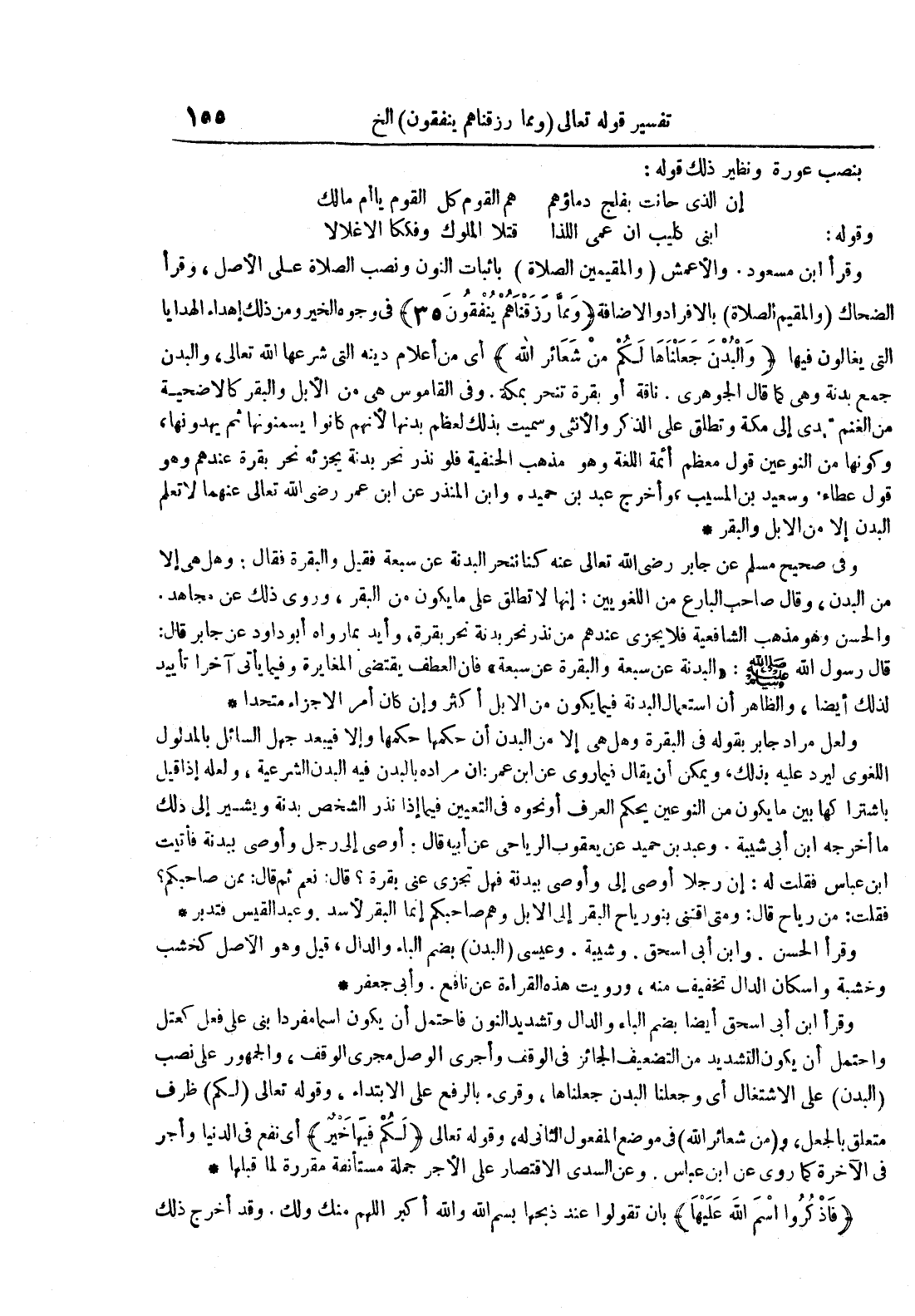 ولعل مراد جابر بقوله في البقرة وهل هي إلا من البدن أن حكمها حكمها وإلا فيبعد جهل السائل بالمدلول اللغوي ليرد عليه بذلك ويمكن أن يقال فيما روي عن ابن عمر : أن مراده بالبدن فيه البدن الشرعية ولعله إذا قيل باشتراكها بين ما يكون من النوعين يحكم العرف أو نحوه في التعيين فيما غذا نذر الشخص بدنة ويشير إلى ذلك ما أخرجه ابن أبي شيبة وعبد بن حميد عن يعقوب الرياحي عن أبيه قال : أوصى إلى رجل وأوصى ببدنة فأتيت ابن عباس فقلت له : إن رجلا أوصى إلي وأوصى ببدنة فهل تجزيء عني بقرة قال : نعم ثم قال : ممن صاحبكم فقلت : من رياح قال : ومتى اقتنى بنو رياح البقر إلى الإبل وهم صاحبكم إنما البقر لأسد وعبد القيس فتدبر