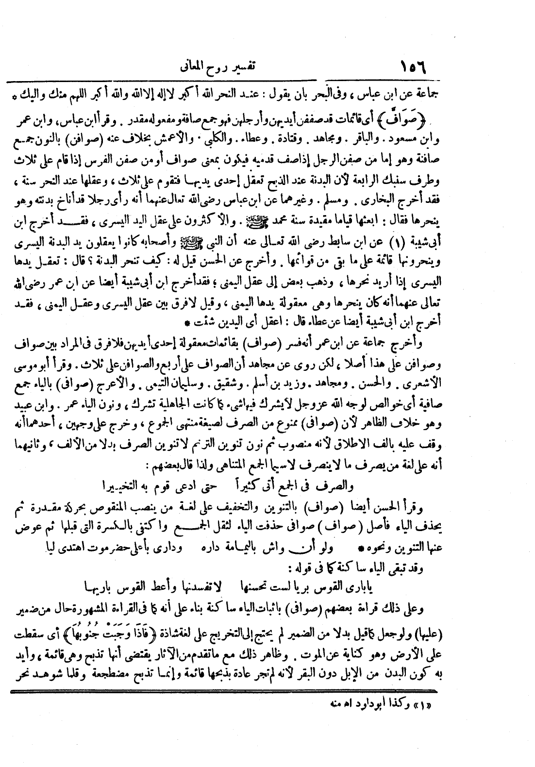 وأخرج جماعة عن ابن عمر أنه فسر صواف بقائمات معقولة إحدى أيديهن فلا فرق في المراد بين صواف وصوافن على هذا أصلا ولكن روي عن مجاهد أن الصواف على أربع والصوافن على ثلاث وقرأأبو موسى الأشعري والحسن ومجاهد وزيد بن أسلم وشقيق وسليمان التيمي والأعرج صوافن بالياء جمع صافية أي خوالص لوجه الله عز و جل لا يشرك فيها شيء كما كانت الجاهلية تشرك ونون الياء عمر وابن عبيد وهو خلاف الظاهر لأن صوافن ممنوع من الصرف لصيغة منتهى الجموع وخرج على وجهين أحدهما أنه وقف عليه بألف الإطلاق لأنه منصوب ثم نون تنوين الترنم لا تنوين الصرف بدلا من الألف وثانيهما أنه على لغة من يصرف ما لا يصرف لا سيما الجمع المتناهي ولذا قال بعضهم : والصرف في الجمع أتى كثيرا حتى ادعى قوم به التخييرا وقرأ الحسن أيضا صواف بالتنوين والتخفيف على لغة من ينصب المنقوص بحركة مقدرة ثم يحذف الياء فأصل صواف صوافي حذفت الياء لثقل الجمع واكتفى بالكسرة التي قبلها ثم عوض عنها التنوين ونحوه