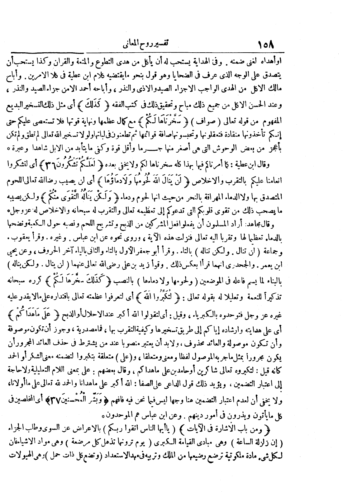 وقال مجاهد : أراد المسلمون أن يفعلوا فعل المشركين من الذبح وتشريح اللحم ونصبه حول الكعبة ونضحها بالدماء تعظيما لها وتقربا إليه تعالى فنزلت هذه الآية وروي نحوه عن ابن عباس وغيره وقرأ يعقوب وجماعة لن تنال ولكن تناله بالتاء وقرأ أبو جعفر الأول بالتاء والثاني بالياء آخر الحروف وعن يحيى ابن يعمر والجحدري أنهما قرأا بعكس ذلك وقرأ زيد بن علي رضي الله تعالى عنهما لن ينال ولكن يناله بالبناء لما يسم فاعله في الموضعين ولحومها ولا دماءها بالنصب كذلك سخرها لكم كرره سبحانه تذكيرا للنعمة وتعليلا له بقوله تعالى : لتكبروا الله أي لتعرفوا عظمته تعالى باقتداره على ما لا يقدر عليه غيره عز و جل فتوحدوه بالكبرياء وقيل : أي لتقولوا الله أكبر عند الإحلال أو الذبح على ما هداكم أي على هدايته وإرشاده إياكم إلى طريق تسخيرها وكيفية التقرب بها فما مصدرية وجوز أن تكون موصوفة وأن تكون موصولة والعائد محذوف ولا بد أن يعتبر منصوبا عند من يشترط في حذف العائد المجرور أن يكون مجرورا بمثل ما جر به الموصول لفظا ومعنى ومتعلقا و على متعلقة بتكروا لتضمنه معنى الشكر أو الحمد كأنه قيل : لتكبروه تعالى شاكرين أو حامدين على ما هداكم وقال بعضهم : على بمعنى اللام التعليلية ولا حاجة إلى اعتبار التضمين ويؤيد ذلك قول الداعي على الصفا : الله أكبر على ما هدانا والحمد لله تعالى على ما أولانا ولا يخفى أن لعدم اعتبار التضمين هنا وجها ليس فيما نحن فيه فافهم وبشر المحسنين