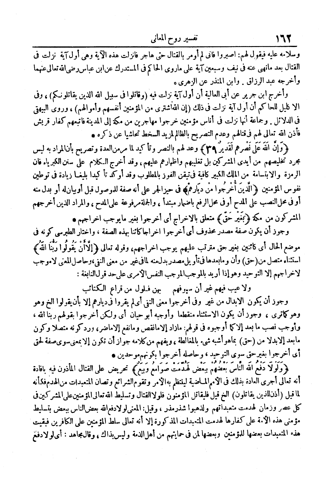 وأخرج ابن جرير عن أبي العالية أن أول آية نزلت فيه وقاتلوا في سبيل الله الذين يقاتلونكم وفي الإكليل للحاكم أن أول آية نزلت في ذلك إن الله اشترى من المؤمنين أنفسهم وأموالهم وروي البيهقي في الدلائل وجماعة أنها نزلت في مؤمنين خرجوا مهاجرين من مكة إلى المدينة فاتبعهم كفار قريش فأذن الله تعالى لهم في قتالهم وعدم التصريح بالظالم لمزيد السخط تحاشيا عن ذكره