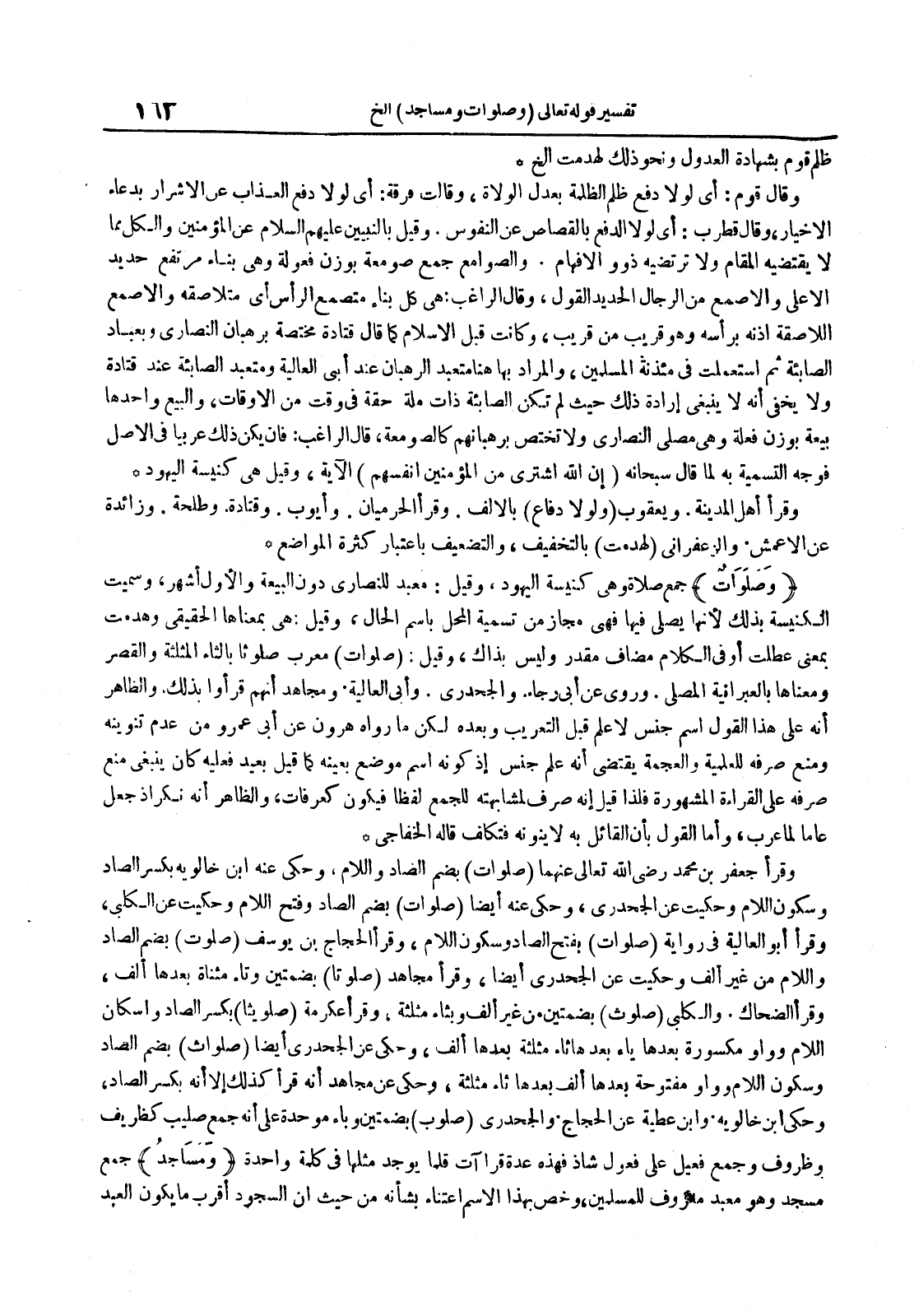 وقرأ جعفر بن محمد رضي الله تعالى عنهما صلوات بضم الصاد واللام وحكى عنه ابن خالويه بكسر الصاد وسكون اللام وحكيت عن الجحدري وحكى عنه أيضا صلوات بضم الصاد وفتح اللام وحكيت عن الكلبي وقرأ أبو العالية في رواية صلوات بفتح الصاد وسكون اللام وقرأ الحجاج بن يوسف صلوات بضم الصاد واللام من غير ألف وحكيت عن الجحدري أيضا وقرأ مجاهد صلوتا بضمتين وتاء مثناة بعدها ألف وقرأ الضحاك والكلبي صلوث بضمتين من غير ألف وبثاء مثلثة وقرأ عكرمة صلويثا بكسر الصاد وإسكان اللام وواو مكسورة بعدها ياء بعدها ثاء مثلثة بعدها ألف وحكي عن الجحدري أيضا صلواث بضم الصاد وسكون اللام وواو مفتوحة بعدها ألف بعدها ثاء مثلثة وحكي عن مجاهد أنه قرأ كذلك إلا أنه بكسر الصاد وحكى ابن خالوية وابن عطية عن الحجاج والجحدري صلوب بضمتين وباء موحدة على أنه جمع صليب كظريف وظروف وجمع فعيل على فعول شاذ فهذه عدة قراآت قلما يوجد مثلها في كلمة واحدة ومساجد جمع مسجد وهو معبد معروف للمسلمين وخص بهذا الاسم اعتناء بشأنه من حيث أن السجود أقرب ما يكون العبد