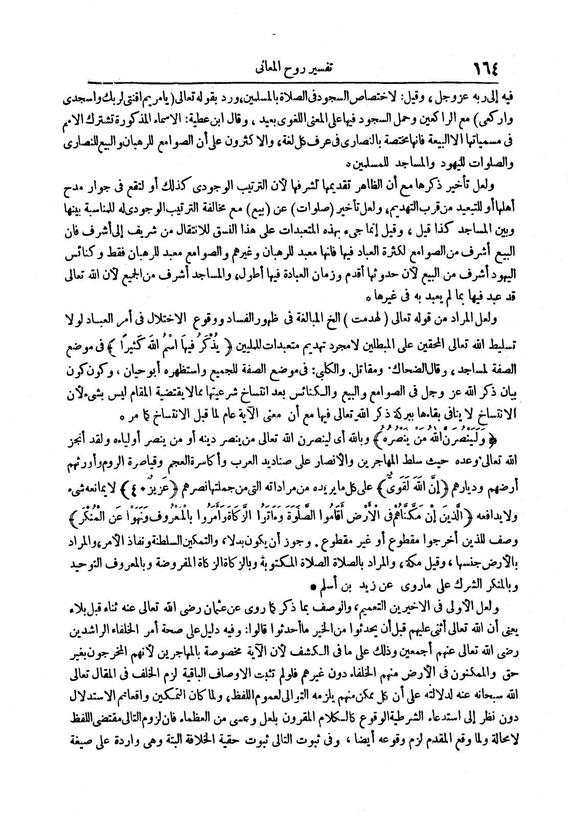 ولعل المراد من قوله تعالى لهدمت الخ المبالغة في ظهور الفساد ووقوع الإختلال في أمر العباد لو لا تسليط الله تعالى المحقين على المبطلين لا مجرد تهديم متعبدات للمليين يذكر فيها اسم الله كثيرا في موضع الصفة لمساجد وقال الضحاك ومقاتل والكلبي : في موضع الصفة للجميع واستظهره أبو حيان وكون كون بيان ذكر الله عز و جل في الصوامع والبيع والكنائس بعد انتساخ شرعيتها مما لا يقتضيه المقام ليس بشيء لأن الإنتساخ لا ينافي بقاءها ببركة ذكر الله تعالى فيها مع أن معنى الآية عام لما قبل الإنتساخ كما مر