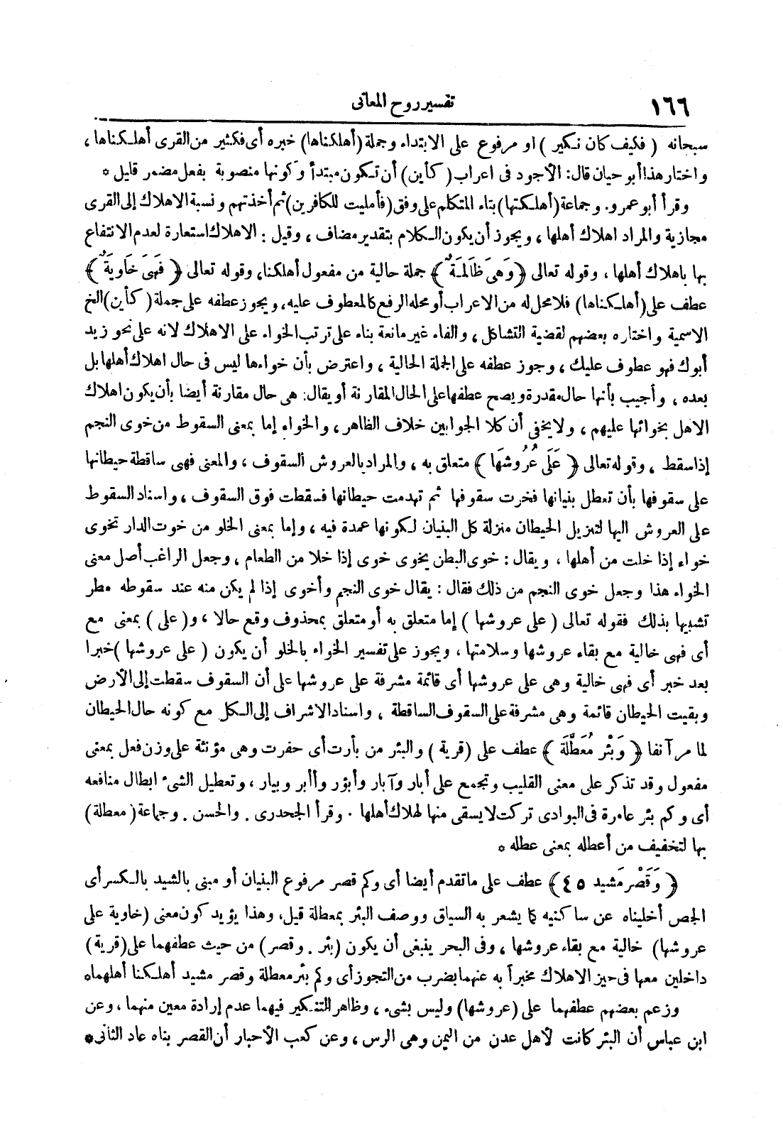 - عطف على ما تقدم أيضا أي وكم قصر مرفوع البنيان أو مبني بالكسر أي الجص أخليناه عن ساكنيه كما يشعر به السياق ووصف البئر بمعطلة قيل وهذا يؤيد كون معنى خاوية على عروشها خالية مع بقاء عروشها وفي البحر ينبغي أن يكون بئر وقصر من حيث عطفهما على قرية داخلين معها في حيز الإهلاك مخبرا به عنهما بضرب من التجوز أي وكم بئر معطلة وقصر مشيد أهلكنا أهلهما