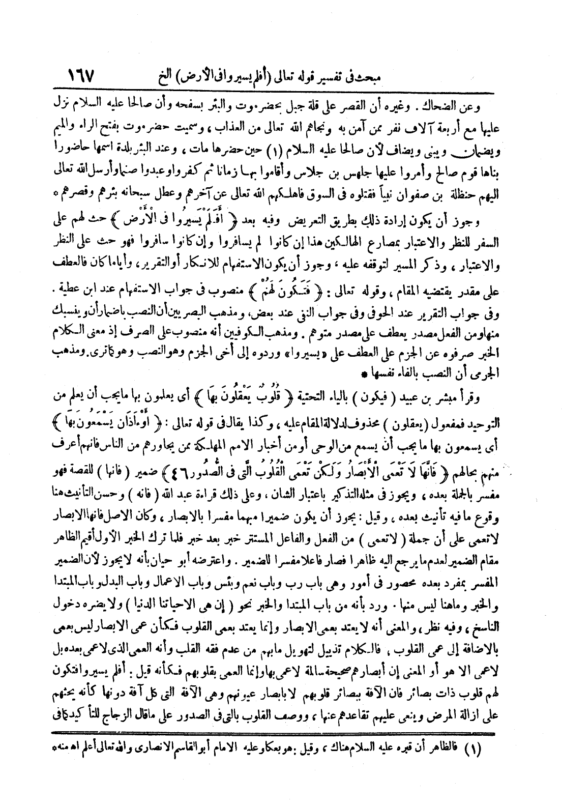 وجوز أن يكون إرادة ذلك بطريق التعريض وفيه بعد أفلم يسيروا في الرض حث لهم على السفر للنظر واعتبار بمصارع الهالكين هذا إن كانوا لم يسافروا وإن كانوا سافروا فهو حث على النظر والإعتبار وذكر المسير لتوقفه عليه وجوز أن يكون الإستفهام للإنكار أو التقرير وأيا ما كان فالعطف على مقدر يقتضيه المقام وقوله تعالى : فتكون لهم منصوب في جواب الإستفهام عند ابن عطية وفي جواب التقرير عند الحوفي وفي جواب النفي عند بعض ومذهب البصريين أن النصب بإضمار أن ينسبك منها ومن الفعل مصدر يعطف على مصدر متوهم ومذهب الكوفيين أنه منصوب على الصرف إذ معنى الكلام الخبر صرفوه عن الجزم على العطف على يسيروا وردوه إلى أخي الجزم وهو النصب وهو كما ترى ومذهب الجرمي أن النصب بالفاء نفسها