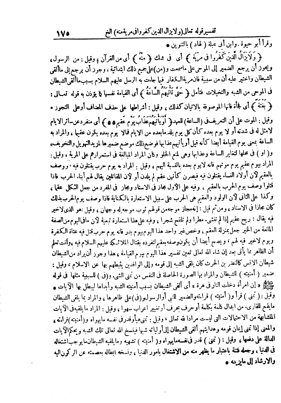 و أو في محلها لتغاير الساعة وعذابها وهي لمنع الخلو وكان المراد المبالغة في استمرارهم على المرية وقيل : المراد بيوم عقيم يوم موتهم فإنه لا يوم بعده بالنسبة إليهم وقيل : المراد به حرب يقتلون فيه ووصف بالعقيم لأن أولاد النساء يقتلون فيه فيصرن كأنهن عقم لم يلدن أو لأن المقاتلين يقال لهم أبناء الحرب فإذا قتلوا وصف يوم الحرب بالعقيم وفيه على الول مجاز في الإسناد ومجاز في المفرد من جعل الثكل عقما وكذا على الثاني لأن الولود والعقيم هو الحرب على سبيل الإستعارة بالكناية فإذا وصف يوم الحرب بذلك كان مجازا في الإسناد ومن ثم قيل : إنه مجاز موجه من قولهم ثوب موجه له وجهان وقيل : هو الذي لا خير فيه يقال : ريح عقيم إذا لم تنشيء مطرا ولم تلقح شجرا وفيه على هذا استعارة تبعية لأن ما في اليوم من الصفة المانعة من الخير جعل بمنزلة العقم وخص غير واحد هذا اليوم بيوم بدر فإنه يوم حرب قتل فيه عتاة الكفرة ويوم لا خير فيه لهم ويصح أيضا أن يكون وصفه بعقيم لتفرده بقتال الملائكة عليهم السلام فيه وأنت تعلم أن الظاهر مما يأتي بعد إن شاء الله تعالى تعين تفسير هذا اليوم بيوم القيامة هذا وجوز أن يراد من الشيطان شيطان الإنس كالنضر بن الحرث كأن يلقى الشبه إلى قومه وإلى الوافدين يثبطهم بها عن الإسلام وقيل : ضمير أمنيته للشيطان والمراد بها الصورة الحاصلة في النفس من تمني الشيء و في للسببية مثلها في قوله صلى الله عليه و سلم إن امرأة دخلت النار في هرة أي ألقى الشيطان بسبب أمنيته الشبه وأبداها ليبطل بها الآيات