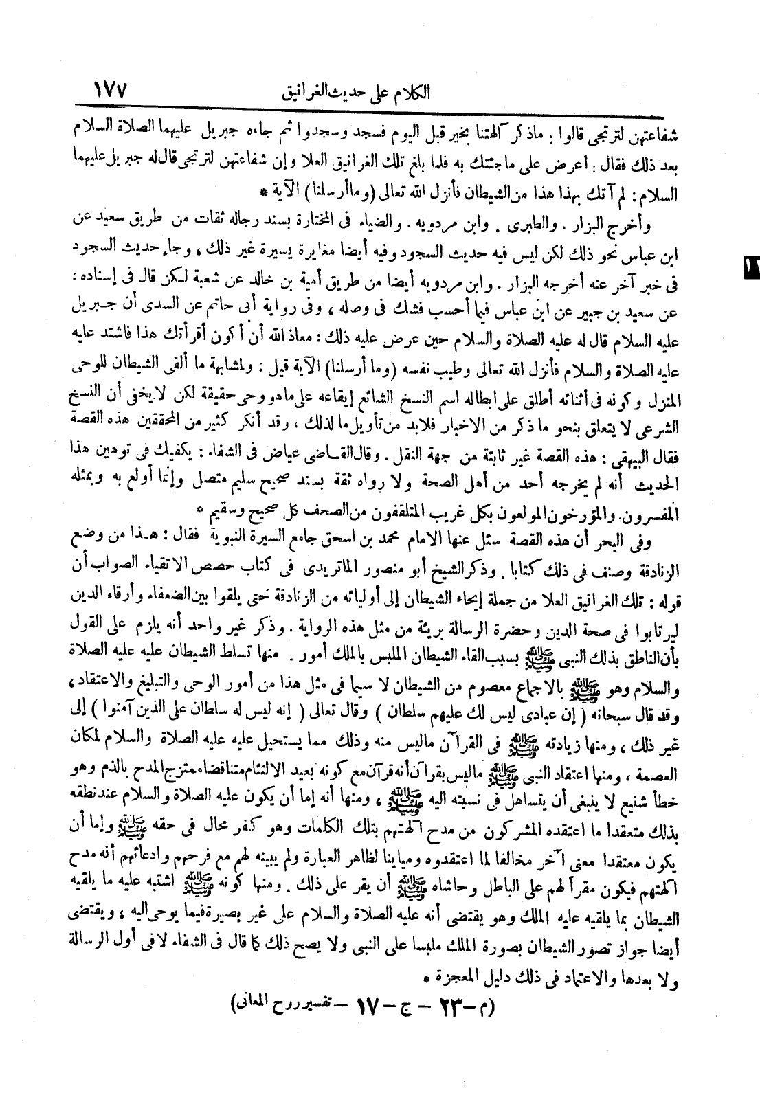 وفي البحر أن هذه القصة سئل عنها الإمام محمد بن إسحاق جامع السيرة النبوية فقال : هذا من وضع الزنادقة وصنف في ذلك كتابا وذكر الشيخ أبو منصور الماتريدي في كتاب حصص الأتقياء الصواب أن قوله : تلك الغرانيق العلا من جملة إيحاء الشيطان إلى أوليائه من الزنادقة حتى يلقوا بين الضعفاء وأرقاء الدين ليرتابوا في صحة الدين وحضرة الرسالة بريئة من مثل هذه الرواية وذكر غير واحد أنه يلزم على القول بأن الناطق بذلك النبي صلى الله عليه و سلم بسبب إلقاء الشيطان الملبس بالملك أمور منها تسلط الشيطان عليه عليه الصلاة و السلام وهو صلى الله عليه و سلم بالإجماع معصوم من الشيطان لا سيما في مثل هذا من أمور الوحي والتبليغ والإعتقاد وقد قال سبحانه إن عبادي ليس لك عليهم سلطان وقال تعالى إنه ليس له سلطان على الذين آمنوا إلى غير ذلك ومنها زيادته صلى الله عليه و سلم في القرآن ما ليس منه وذلك مما يستحيل عليه الصلاة و السلام لمكان العصمة ومنها اعتقاد النبي صلى الله عليه و سلم ما ليس بقرآن أنه قرآن مع كونه بعيد الإلتئام متناقضا ممتزج المدح بالذم وهو خطأ شنيع لا ينبغي أن يتساهل في نسبته إليه صلى الله عليه و سلم ومنها أنه إما أن يكون عليه الصلاة و السلام عند نقطة بذلك متعقدا ما اعتقده المشركون من مدح آلهتهم بتلك الكلمات وهو كفر محال في حقه صلى الله عليه و سلم وإما أن يكون معتقدا معنى آخر مخالفا لما اعتقدوه ومياينا لظاهر العبارة ولم يبينه لهم مع فرحهم وادعائهم أنه مدح آلهتهم فيكون مقرا لهم على الباطل وحاشاه صلى الله عليه و سلم أن يقر على ذلك ومنها كونه صلى الله عليه و سلم اشتبه عليه ما يلقيه الشيطان بما يلقيه عليه الملك وهو يقتضي أنه عليه الصلاة و السلام على غير بصيرة فيما يوحى إليه ويقتضي أيضا جواز تصور الشيطان بصورة الملك ملبسا على النبي ولا يصح ذلك كما قال في الشفعاء لا في أول الرسالة ولا بعدها والإعتماد في ذلك دليل المعجزة