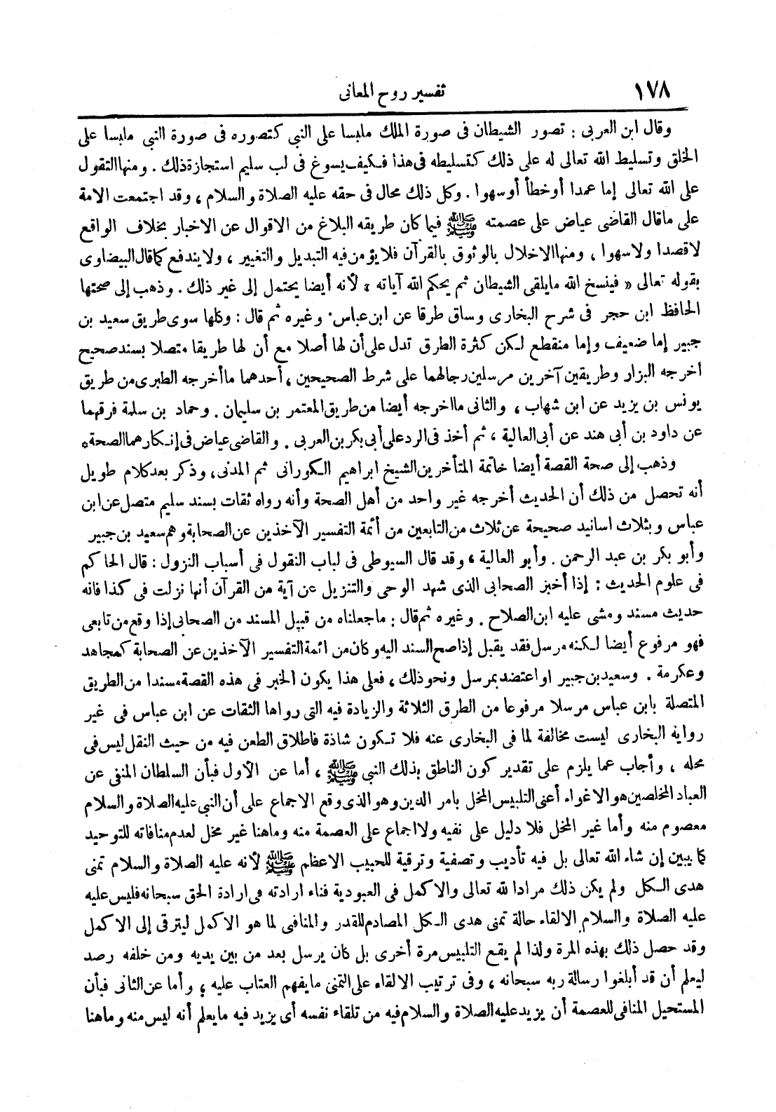 وقال ابن العربي : تصور الشيطان في صورة الملك ملبسا على النبي كتصوره في صورة النبي ملبسا على الخلق وتسليط الله تعالى له على ذلك كتسليطه في هذا فكيف يسوغ في لب سليم استجازة ذلك ومنها التقول على الله تعالى إما عمدا أو خطأ أو سهوا وكل ذلك محال في حقه عليه الصلاة و السلام وقد اجتمعت الأمة على ما قال القاضي عياض على عصمته صلى الله عليه و سلم فيما كان طريقه البلاغ من الأقوال عن الأخبار بخلاف الواقع لا قصدا ولا سهوا ومنها الإخلال بالوثوق بالقرآن فلا يؤمن فيه التبديل والتغيير ولا يندفع كما قال البيضاوي بقوله تعالى فينسخ الله ما يلقى الشيطان ثم يحكم الله آياته لأنه أيضا يحتمل إلى غير ذلك وذهب إلى صحتها الحافظ ابن حجر في شرح البخاري وساق طرقا عن ابن عباس وغيره ثم قال : وكلها سوى طريق سعيد بن جبير إما ضعيف وإما منقطع لكن كثرة الطرق تدل على أن لها أصلا مع أن لها طريقا بسند صحيح أخرجه البزار وطريقين آخرين مرسلين رجالهما على شرط الصحيحين أحدهما ما أخرجه الطبري من طريق يونس بن يزيد عن ابن شهاب والثاني ما أخرجه أيضا من طريق المعتمر بن سليمان وحماد بن سلمة فرقهما عن داود بن أبي هند عن أبي العالية ثم أخذ الرد على أبي بكر بن العربي والقاضي عياض في إنكارهما الصحة