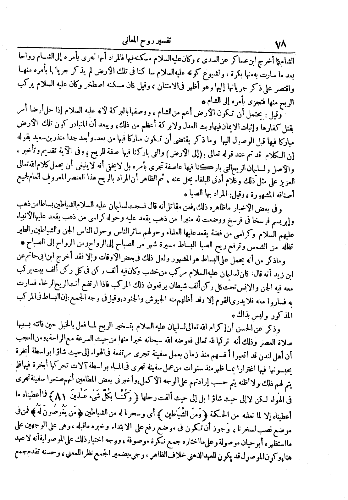 وذكر عن الحسن أن إكران الله تعالى لسليمان عليه السلام بتسخير الريح لما فعل بالخيل حين فاتته بسببها صلاة العصر وذلك أنه تركها لله تعالى فعوضه الله سبحانه خيرا منها من حيث السرعة مع الراحة ومن العجب أن أهل لندن قد اتبعوا أنفسهم منذ زمان يعمل سفينة تجري مرتفعة في الهواء إلى حيث شاؤا بواسطة أبخرة يحبسونها فيها اغترارا بما ظهر منذ سنوات من عمل سفينة تجري في الماء بواسطة آلات تحركها ابخرة فيها فلم يتم لهم ذلك ولا أظنه يتم حسب إرادتهم على الوجه الأكمل وأخبرني بعض المطلعين أنهم صنعوا سفينة تجري في الهواء لكن لا إلى حيث شاؤا بل إلى حيث ألقت رحلها وكنا بكل شيء عالمين