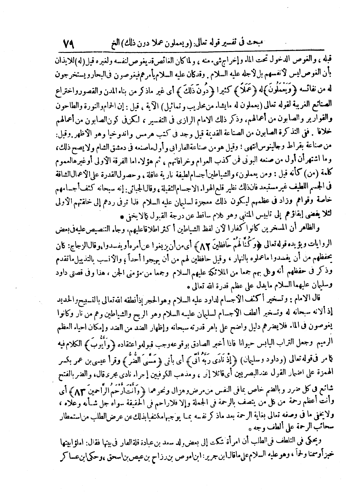 قبله والغوص والدخول تحت الماء وإخراج شيء منه ولما كان الغائص يغوص لنفسه ولغيره قيل له للإيذان بأن الغوص ليس لأنفسهم بل لأجله عليه السلام وقد كان عليه السلام يأمرهم فيغوصون في البحار ويستخرجون له من نفائسه وبعملون له عملا كثيرا دون ذلك أي غير ما ذكر من بناء المدن والقصور واختراع الصنائع الغريبة لقوله تعالى يعملون له ما يشاء من محاريب وتماثيل الآية قيل : إن الحمام والنورة والطاحون والقوارير والصابون من أعمالهم وذكر ذلك الإمام الرازي في التفسير لكن في كون الصابون من أعمالهم خلافا ففي التذكرة الصابون من الصناعة القديمة قيل وجد في كتب هرمس وأندوخيا وهو الأظهر وقيل : من صناعة بقراط وجالينوس انتهى وقيل هو من صناعة الفارابي وأول ما صنعه في دمشق الشام ولا يصح ذلك وما اشتهر أن أول من صنعه البوني فمن كذب العوام وخرافاتهم ثم هؤلاء إما الفرقة الأولى أو غيرها لعموم كلمة من كأنه قيل : ومن يعملون والشياطين أجسام نارية عاقلة وحصول القدرة على الأعمال الشاقة في الجسم اللطيف غير مستبعد فإن ذلك نظير قلع الهواء الأجسام الثقيلة إنه سبحانه كثف أجسامهم خاصة وقواهم وزاد في عظمهم ليكون ذلك معجزة لسليمان عليه السلام فلما توفى ردهم إلى خلقتهم الأولى لئلا يفضي إبقاؤهم إلى تلبيس المتنبي وهو كلام ساقط على درجة القبول كما لا يخفى