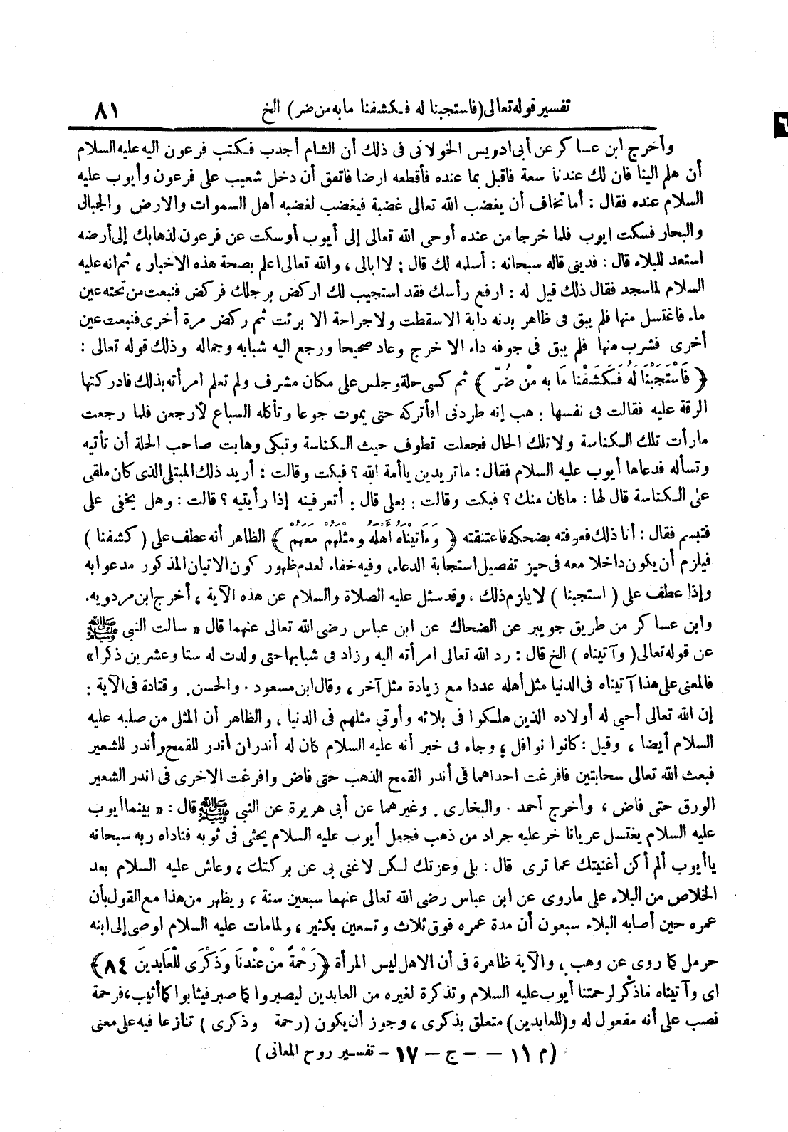 وأخرج ابن عساكر عن أبي إدريس الخولاني في ذلك أن الشام أجدب فكتب فرعون إليه عليه السلام أن هلم إلينا فإن لك عندنا سعة فأقبل فأطعمه أرضا فاتفق أن دخل شعيب على فرعون وأيوب عليه السلام عنده فقال : أما تخاف أن يغضب الله تعالى غضبة فيغضب لغضبه أهل السماوات والأرض والجبال والبحار فسكت أيوب فلما خرجا من عنده أوحى الله تعالى إلى أيوب أوسكت عن فرعون لذهابك إلى أرضه استعد للبلاء قال : فديني قال سبحانه : أسلمه لك قال : لا أبالي والله تعالى أعلم بصحة هذه الأخبار ثم أنه عليه السلام لما سجد فقال ذلك قيل له : ارفع رأسك فقد استجيب لك اركض برجلك فركض فنبعت من تحته عين ماء فاغتسل منها فلم يبق في ظاهر بدنه دابة إلا سقطت ولا جراحة إلا برئت ثم ركض امرة أخرى فنبعت عين أخرى فشرب منها فلم يبق في جوفه داء إلا خرج وعاد صحيحا ورجع إليه شبابه وجماله وذلك قوله تعالى : فاستجبنا له فكشفنا ما به من ضر ثم كسى حلة وجلس على مكان مشرف ولم تعلم امرأته بذلك فأدركتها الرقة عليه فقالت في نفسها : هب إنه طردني أفأتركه حتى يموت جوعا وتأكله السباع لأرجعن فلما رجعت ما رأت تلك الكنسة ولا تلك الحال فجعلت تطوف حيث الكناسة وتبكي وهابت صاحب الحلة أن تأتيه وتسأله فدعاها أيوب عليه السلام فقال : ما تريدين يا أمة الله فبكت وقالت : أريد ذلك المبتلى الذي كان ملقى على الكناسة قال لها : ما كان منك فبكت وقالت : بعلي قال : أتعرفينه إذا رأيته قالت : وهل يخفى علي فتبسم فقال : أنا ذلك فعرفته بضحكه فاعتنقته وآتيناه أهله ومثلهم معهم الظاهر أنه عطف على كشفنا فيلزم أن يكون داخلا معه في حيز تفصيل استجابة الدعاء وفيه خفاء لعدم ظهور كون الإتيان المذكور مدعوا به وإذا عطف على استجبنا لا يلزم ذلك وقد سئل عليه الصلاة و السلام عن هذه الآية أخرج ابن مردوية وابن عساكر من طريق جويبر عن الضحاك عن ابن عباس رضي الله تعالى عنهما قال سألت النبي صلى الله عليه و سلم عن قوله تعالى وآتيناه الخ قال : رد الله تعالى امرأته إليه وزاد في شبابها حتى ولدت له ستا وعشرين ذكرا فالمعنى على هذا آتيناه في الدنيا مثل أهله مع زيادة مثل آخر وقال ابن مسعود والحسن وقتادة في الآية : إن الله تعالى أحي له أولاده الذين هلكوا في بلائه وأوتي مثلهم في الدنيا والظاهر أن المثل من صلبه عليه السلام أيضا وقيل : كانوا نوافل وجاء في خبر أنه عليه السلام كان له أندران أندر للقمح وأندر للشعير فبعث الله تعالى سحابتين فأفرغت إحداهما في أندر القمح الذهب حتى فاض وأفرغت الأخرى في أندر الشعير الورق حتى فاض وأخرج أحمد والبخاري وغيرهما عن أبي هريرة عن النبي صلى الله عليه و سلم قال : بينما أيوب عليه السلام يغتسل عريانا خر عليه جراد من ذهب فجعل أيوب عليه السلام يحثي في ثوبه فناداه ربه سبحانه يا أيوب ألم أكن أغنيتك عما ترى قال : بلى وعزتك لكن لا غنى بي عن بركتك وعاش عليه السلام بعد الخلاص من البلاء على ما روي عن ابن عباس رضي الله تعالى عنهما سبعين سنة ويظهر من هذا مع القول بأن عمره حين أصابه البلاء سبعون أن مدة عمره فوق ثلاث وتسعين بكثير ولما مات عليه السلام أوصى إلى ابنه حرمل كما روي عن وهب والآية ظاهرة في أن الأهل ليس المرأة رحمة من عندنا وذكرى للعابدين
