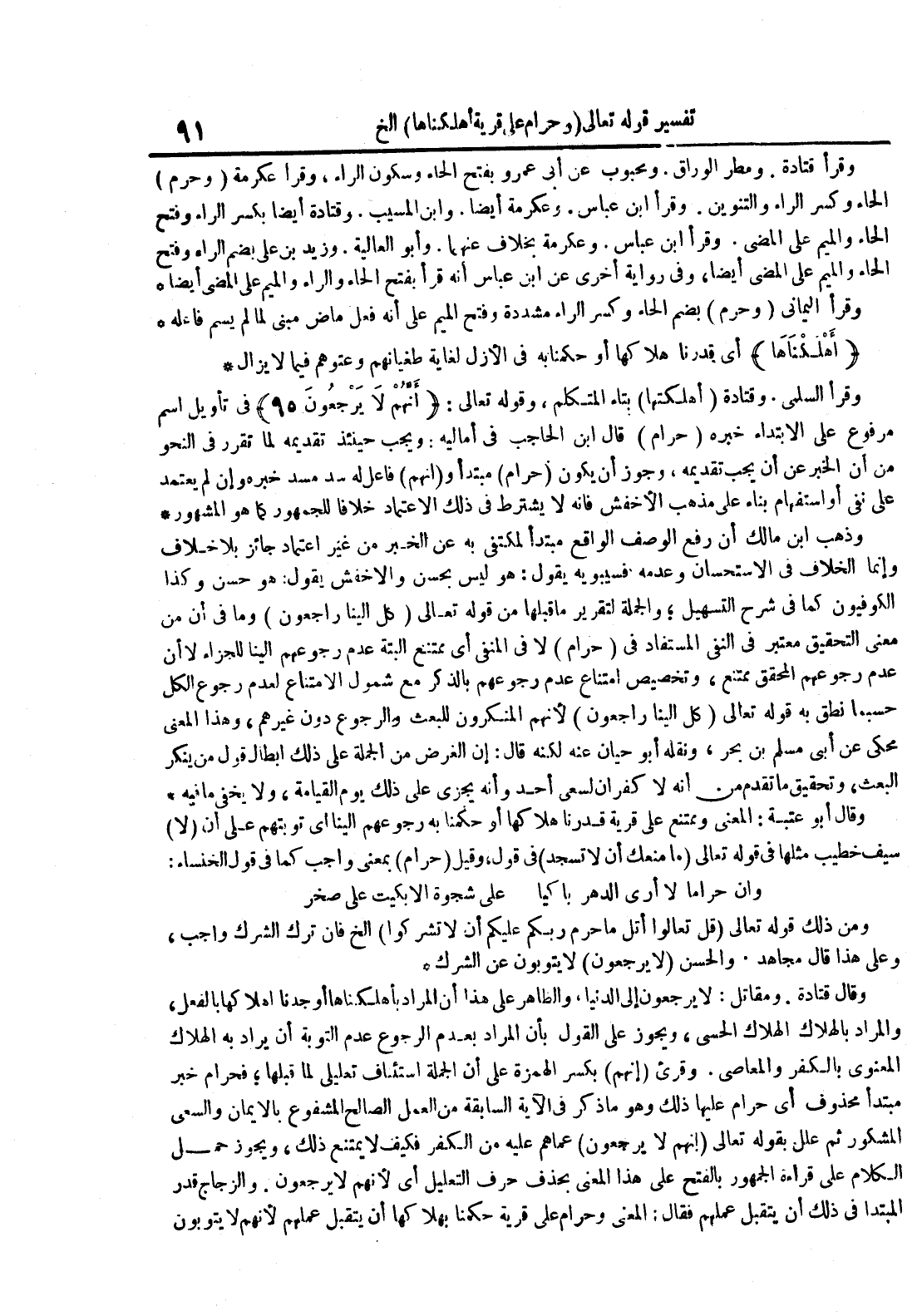 وقال أبو عتبة : المعنى وممتنع على قرية قدرنا هلاكها أو حكمنا به رجوعهم إلينا أي توبتهم على أن لا سيف خطيب مثلها في قوله تعالى ما منعك أن لا تسجد في قول وقيل حرام بمعنى واجب كما في قول الخنساء : وإن حراما لا أرى الدهر باكيا على شجوة إلا بكيت على صخر ومن ذلك قوله تعالى قل تعالى أتل ما حرم ربكم عليكم أن لا تشركوا الخ فإن ترك الشرك واجب وعلى هذا قال كجاهد والحسن لا يرجعون لا يتوبون عن الشرك