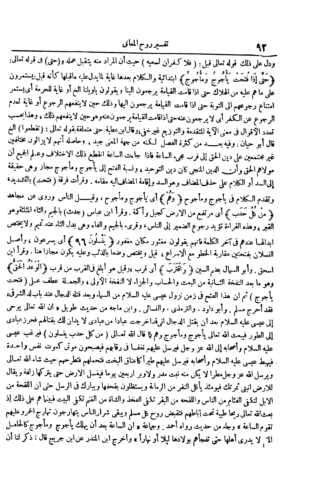 ودل على ذلك قوله تعالى قبل : فلا كفران لسعيه حيث أن المراد منه يتقبل عمله و حتى في قوله تعالى : حتى إذا فتحت يأجوج ومأجوج ابتدائية والكلام بعدها غاية لما يدل عليه ما قبلها كأنه قيل : يستمرون على ما هم عليه من الهلاك حتى إذا قامت القيامة يرجعون إلينا ويقولون يا ويلنا الخ أو غاية للحرمة أي يستمر امتناع رجوعهم إلى التوبة حتى إذا قامت القيامة يرجعون إليها وذلك حين لا ينفعهم الرجوع أو غاية لعدم الرجوع عن الكفر أي لا يرجعون عنه حتى إذا قامت القيامة يرجعون عنه وهو حين لا ينفعهم ذلك وهذا بحسب تعدد الأقوال في معنى الآية المتقدمة والتوزيع غير خفي وقال ابن عطية حتى متعلقة بقوله تعالى : تقطعوا الخ قال أبو حيان : وفيه بعد من كثرة الفصل لكنه من جهة المعنى جيد وحاصله أنهم لايزالون مختلفين غير مجتمعين على دين الحق إلى قرب مجيء الساعة فإذا جاءت الساعة انقطع ذلك الإختلاف وعلم الجميع أن مولاهم الحق وأن الدين المنجي كان دين التوحيد ونسبة الفتح إلى يأجوج ومأجوج مجاز وهي حقيقة إلى السد أو الكلام على حذف المضاف وهو السد وإقامة المضاف إليه مقامه وقرأت فرقة فتحت بالتشديد وتقدم الكلام في يأجوج ومأجوج وهم أي يأجوج ومأجوج وقيل الناس وروي عن مجاهد من كل حدب أي مرتفع من الأرض كجبل وأكمة وقرأ ابن عباس جدث بالجيم والثاء المثلثة وهو القبر وهذه القراءة تؤيد رجوع الضمير إلى الناس وقريء بالجيم والفاء وهي بدل الثاء عند تميم ولا يختص إبدالها عندهم في آخر الكلمة فإنهم يقولون مغثور مكان مغفور ينسلون